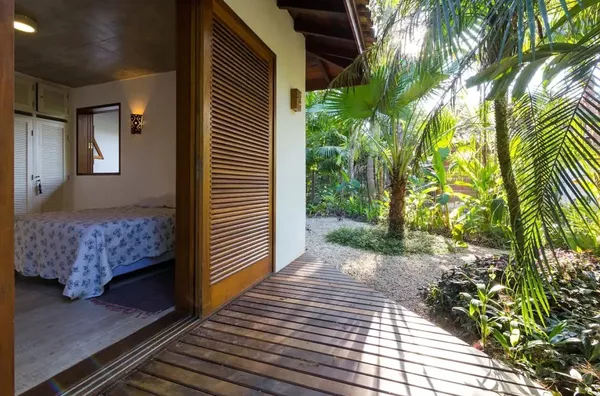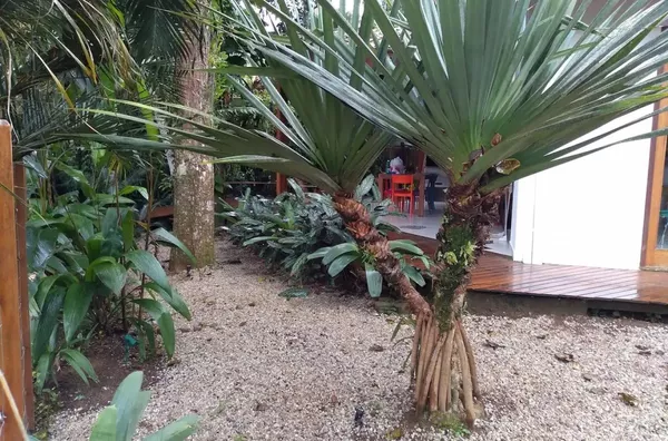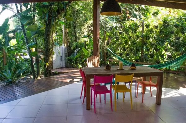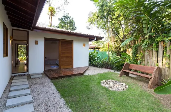 Casa charmosa com muito jardim, vizinhança tranquila, a apenas 140 metros do mar, acomoda até 8 pessoas.