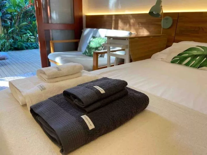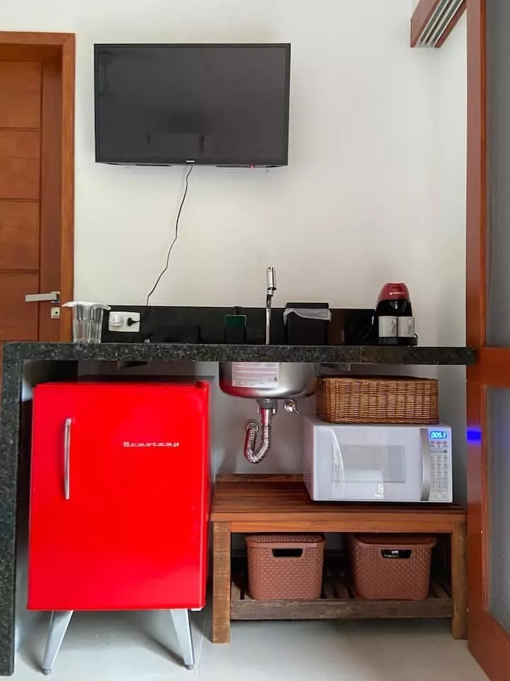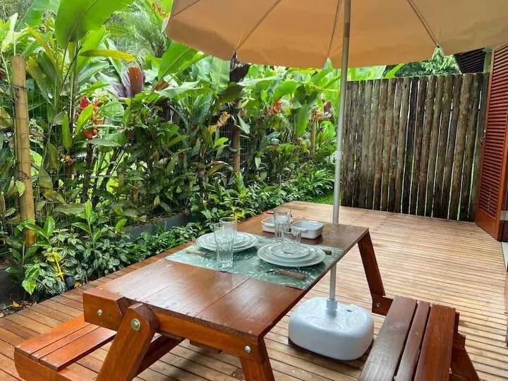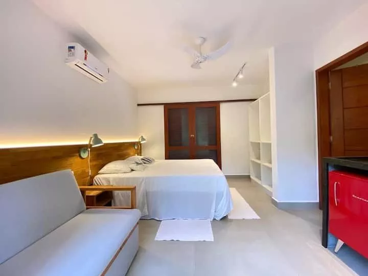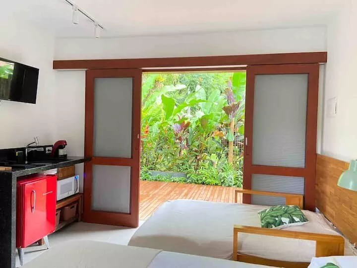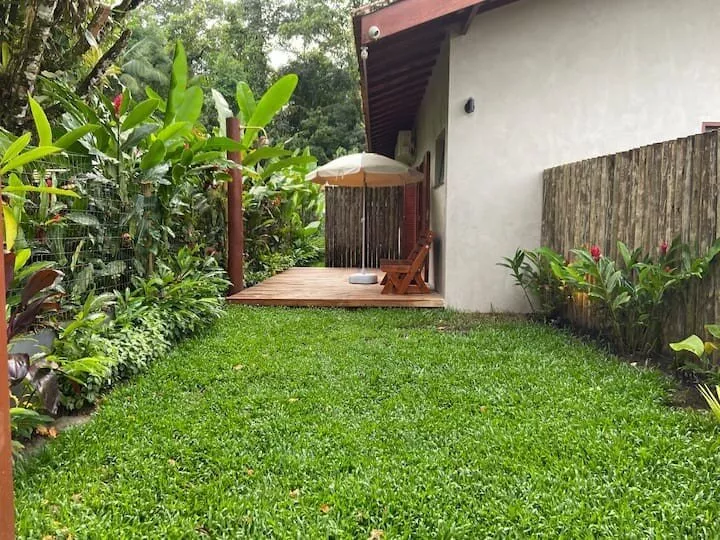 Suíte com mini cozinha, sofá cama e um deck privativo. Rua lado par da praia com mais tranquilidade, PERFEITA para Casal. *Não é permitido PET. Nem fazer festas grandes com som alto.