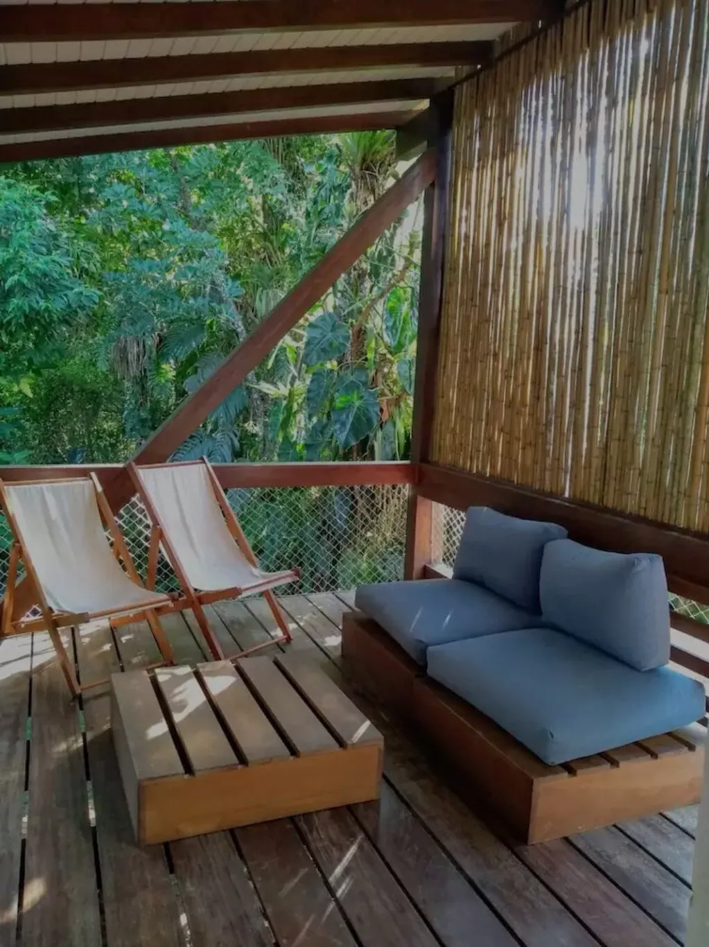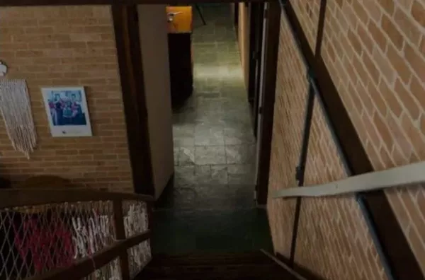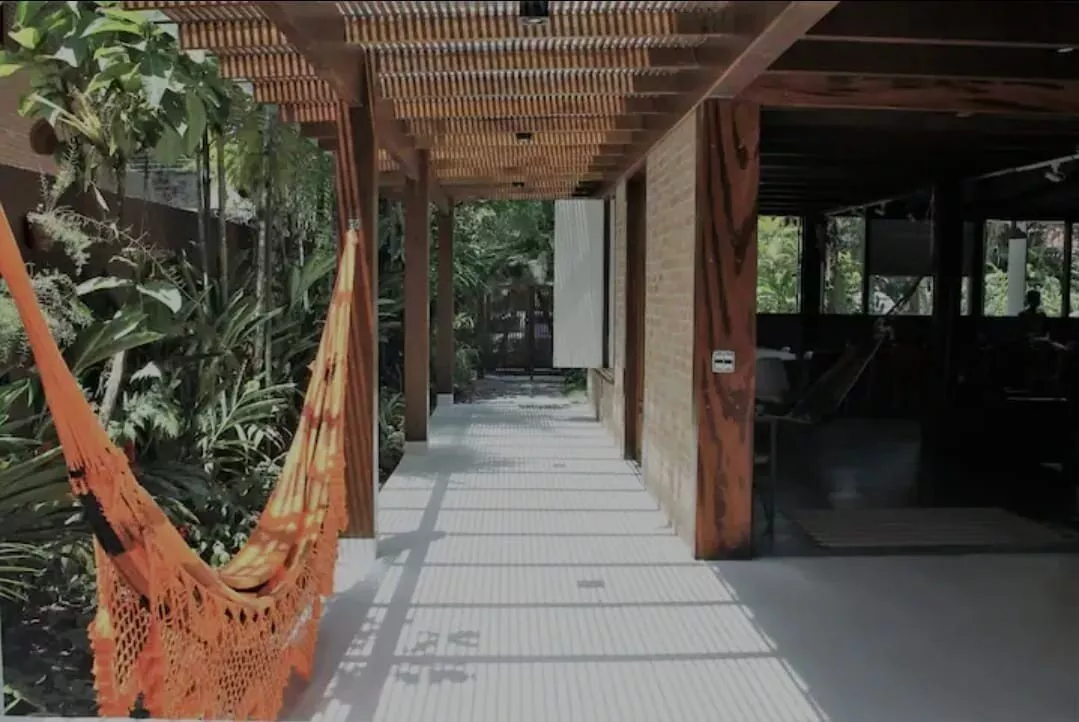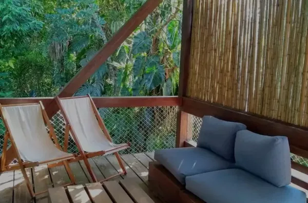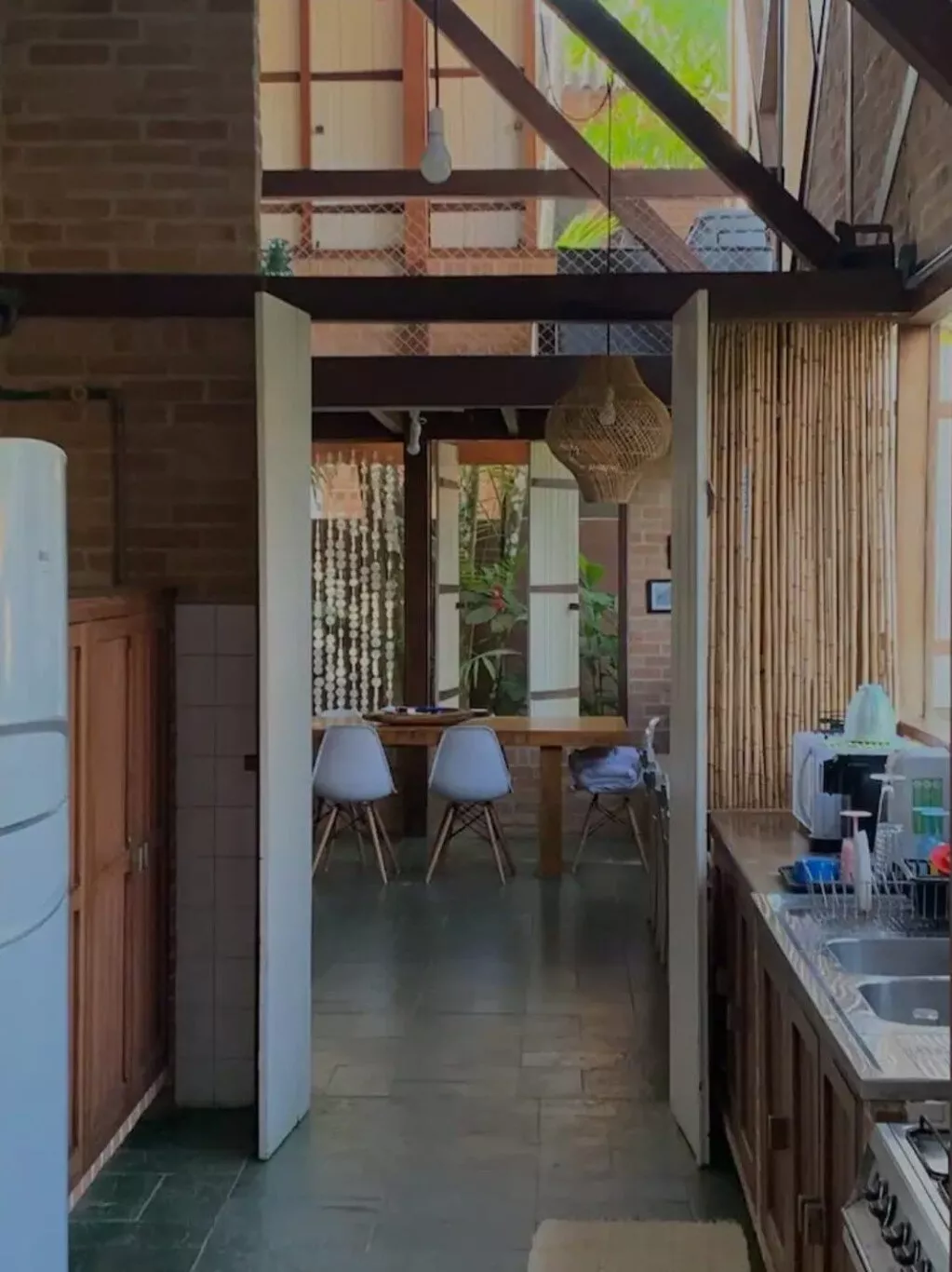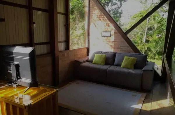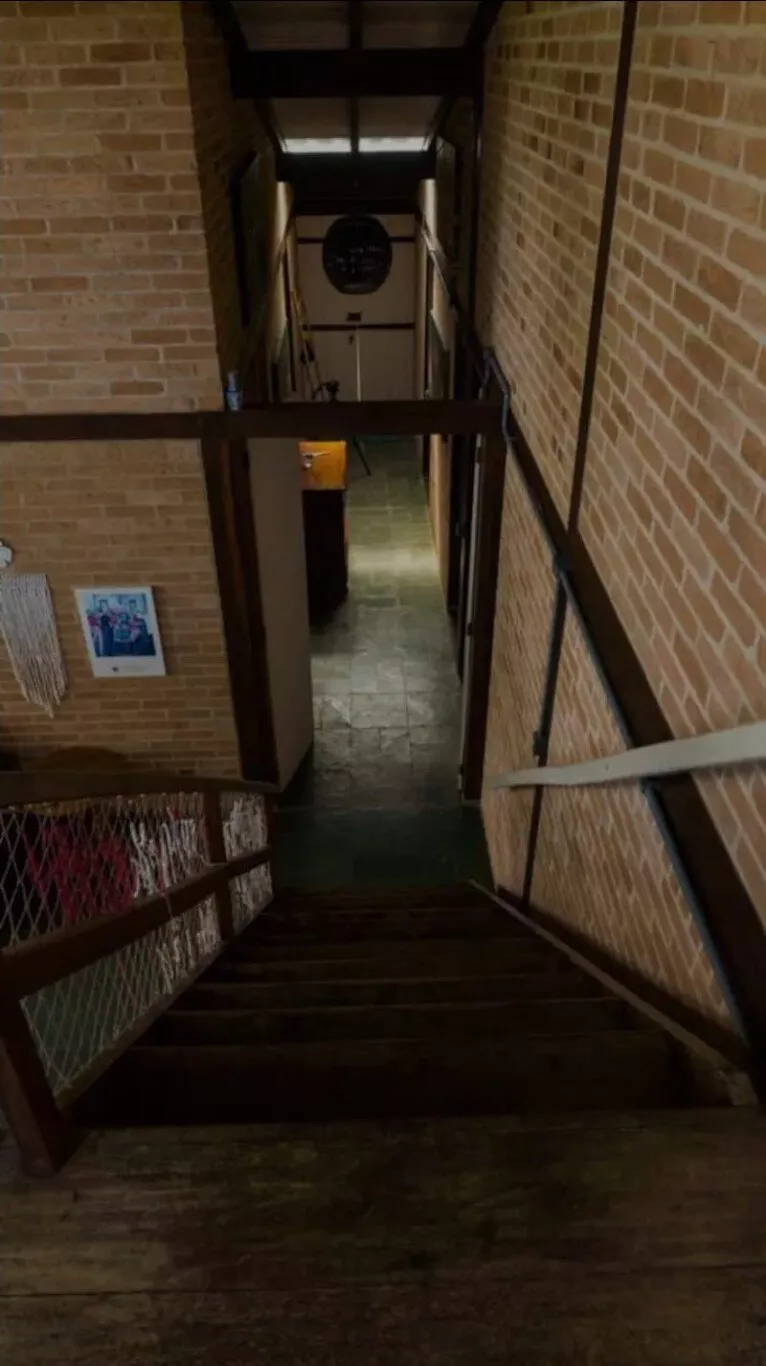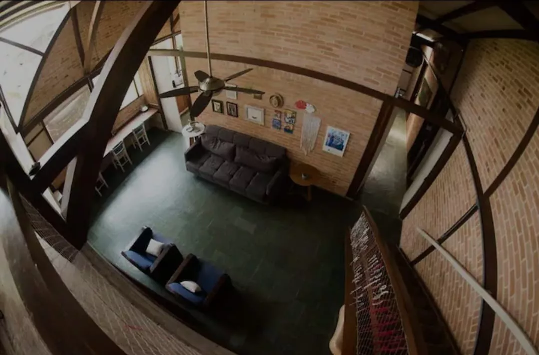 Temos um mezanino que guarda a área de TV com uma escada de acesso. Essa é a única parte da casa que se utiliza escadas.