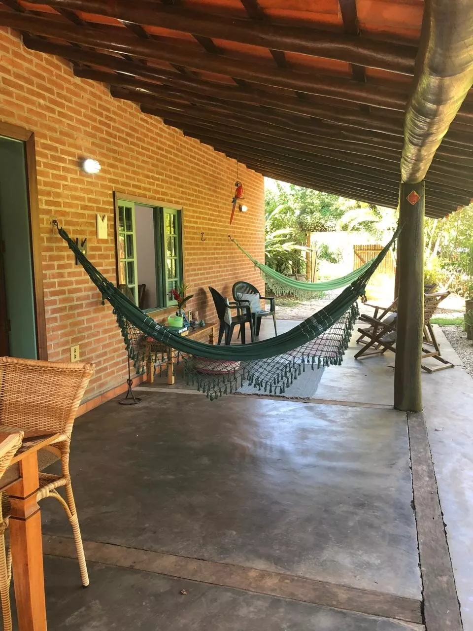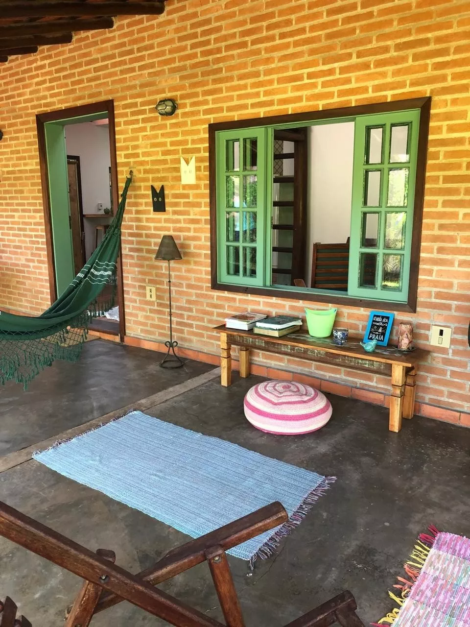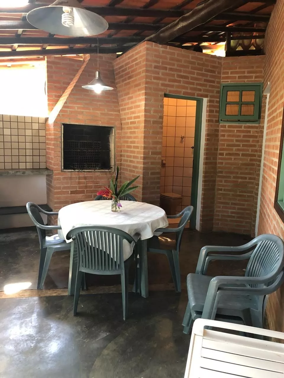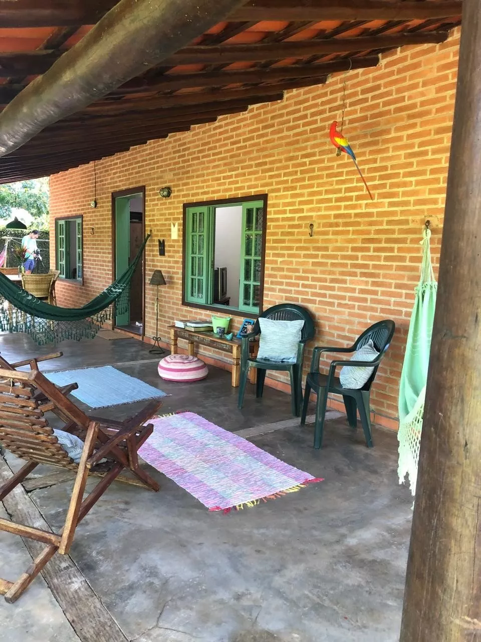 Casa de tijolos rústica, com ampla varanda e área de churrasco, belo jardim adaptado para cadeirantes