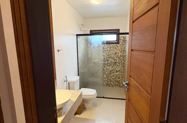 São 4 suítes com ar-condicionado, todas bem decoradas, com aquela vibe leve e descomplicada. A área social é um convite ao convívio: sala de estar com lavabo, cozinha e sala de jantar integradas, tudo aberto para as varandas, que têm vista para um jardim incrível, com paisagismo bem cuidado.