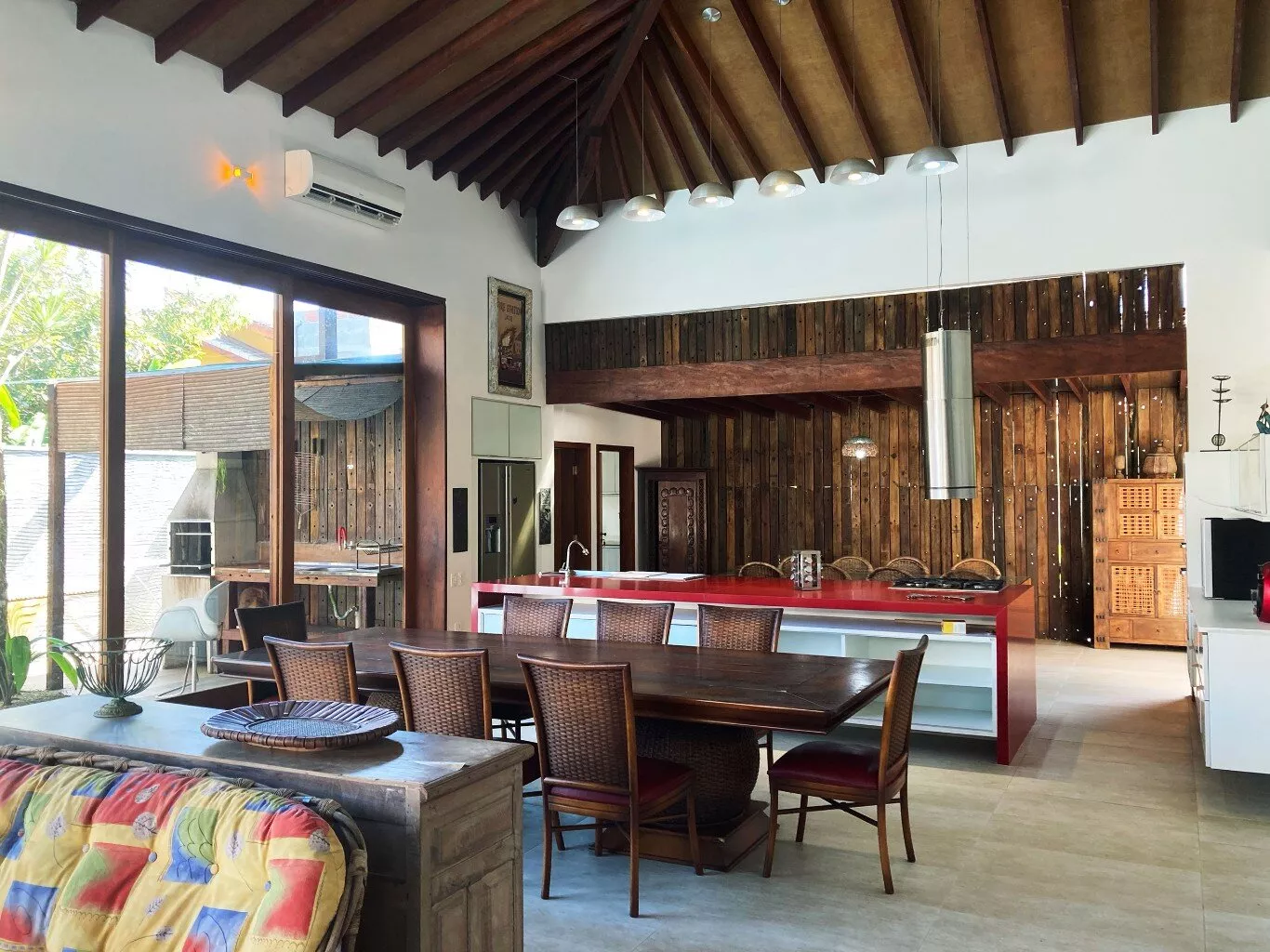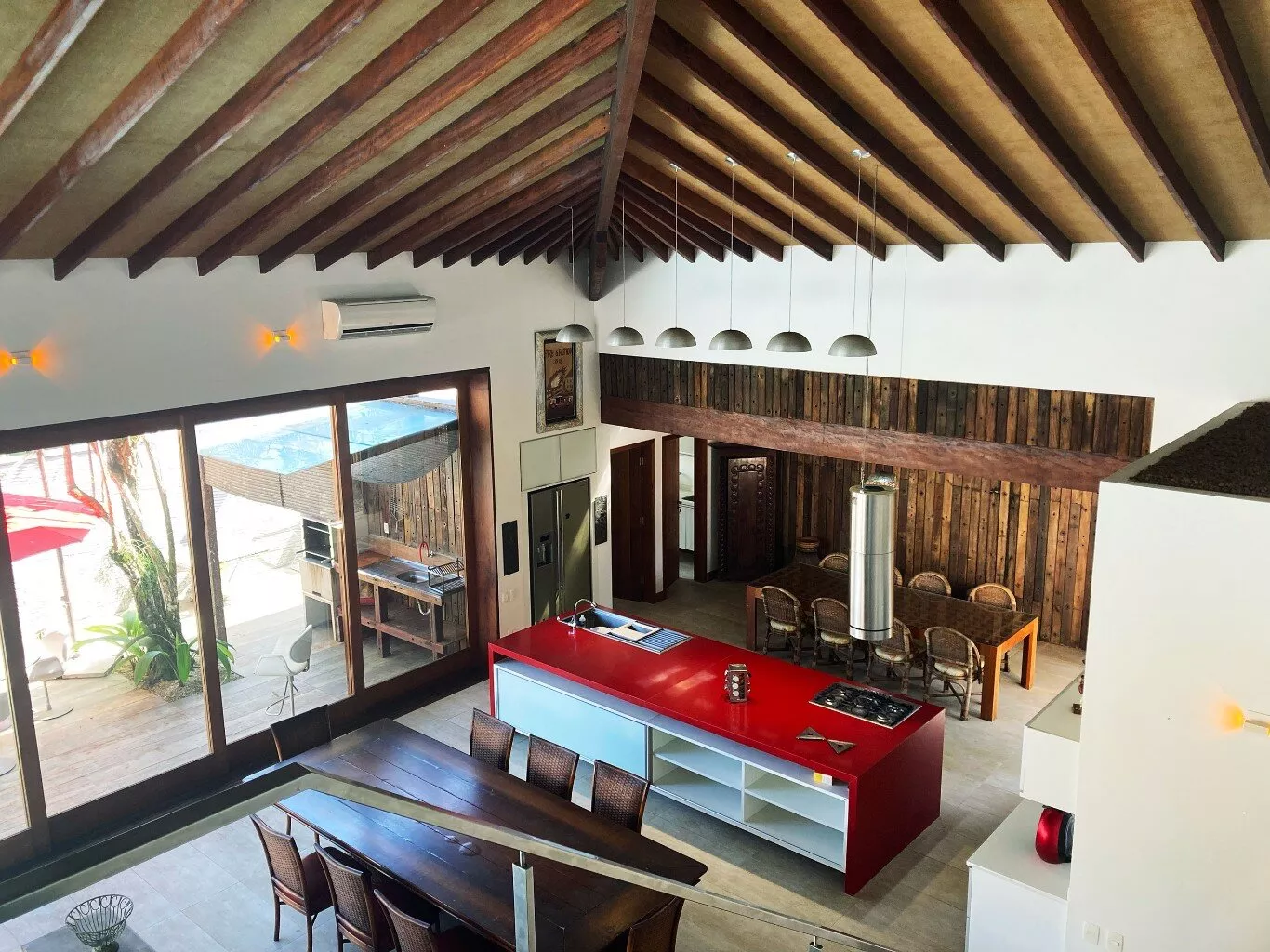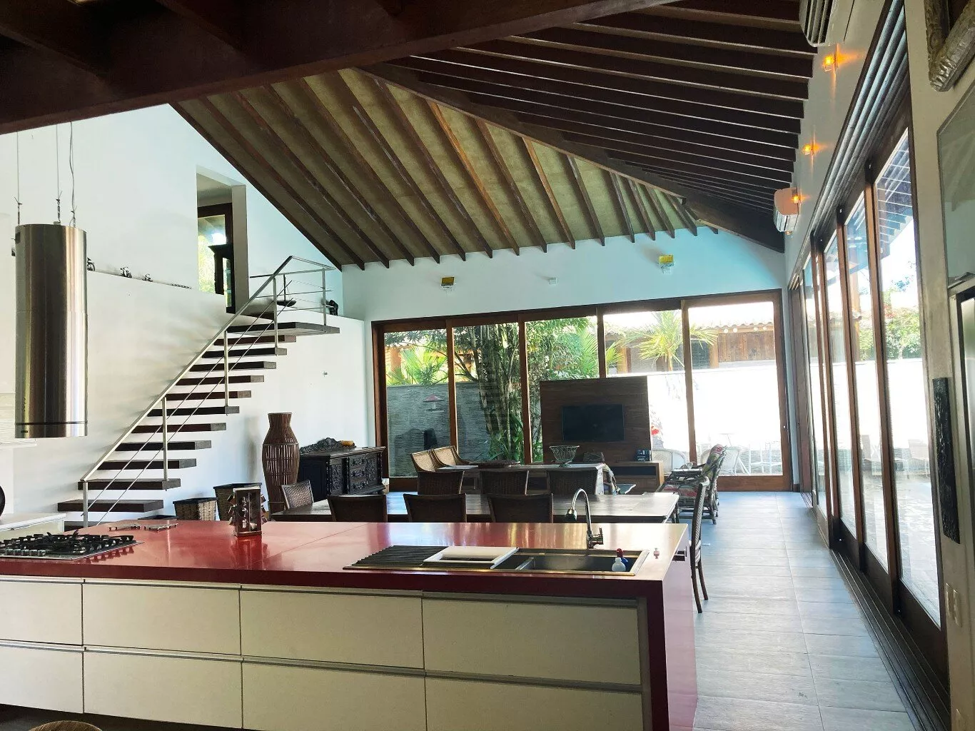 O coração da casa é a espaçosa sala de estar, com aproximadamente 100 m², que se integra perfeitamente à cozinha gourmet e à área de churrasqueira. O pé-direito alto e duplo, aliado às grandes janelas de vidro, permite que a luz natural inunde todos os ambientes, criando uma sensação de amplitude e conexão direta com a natureza ao redor.