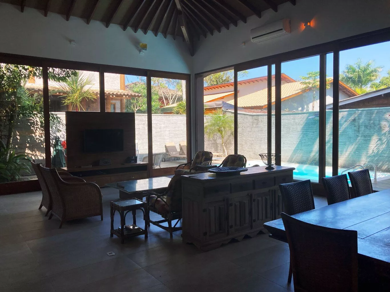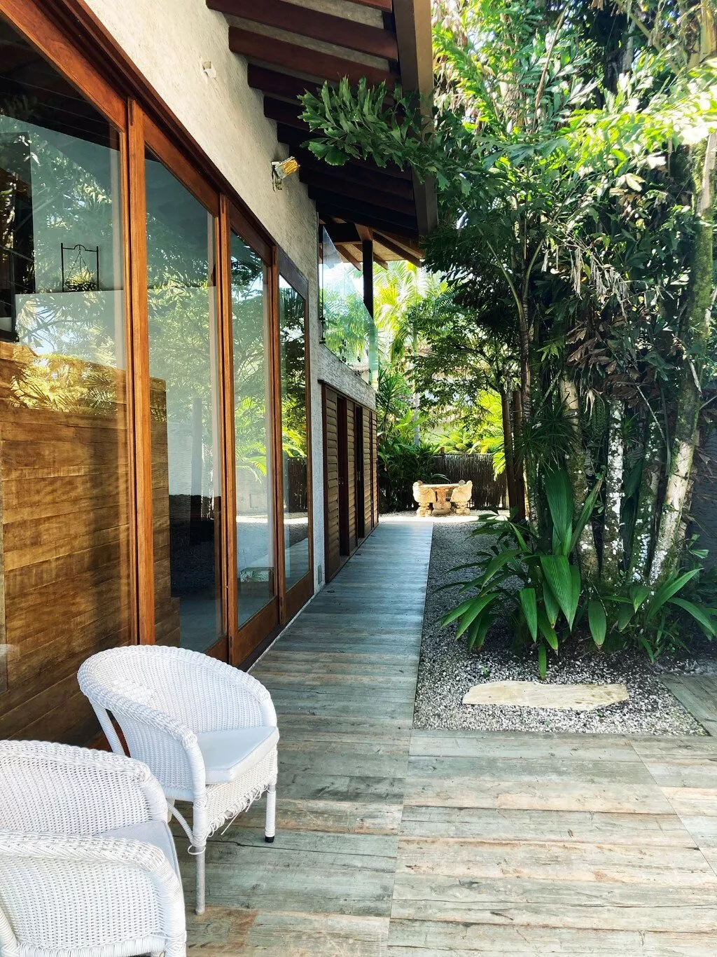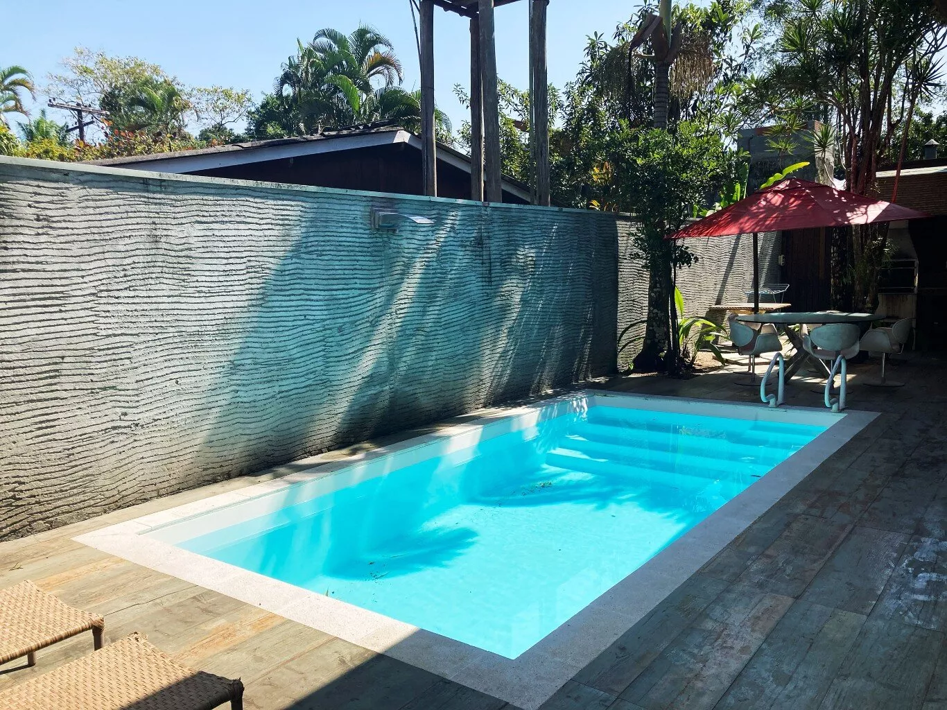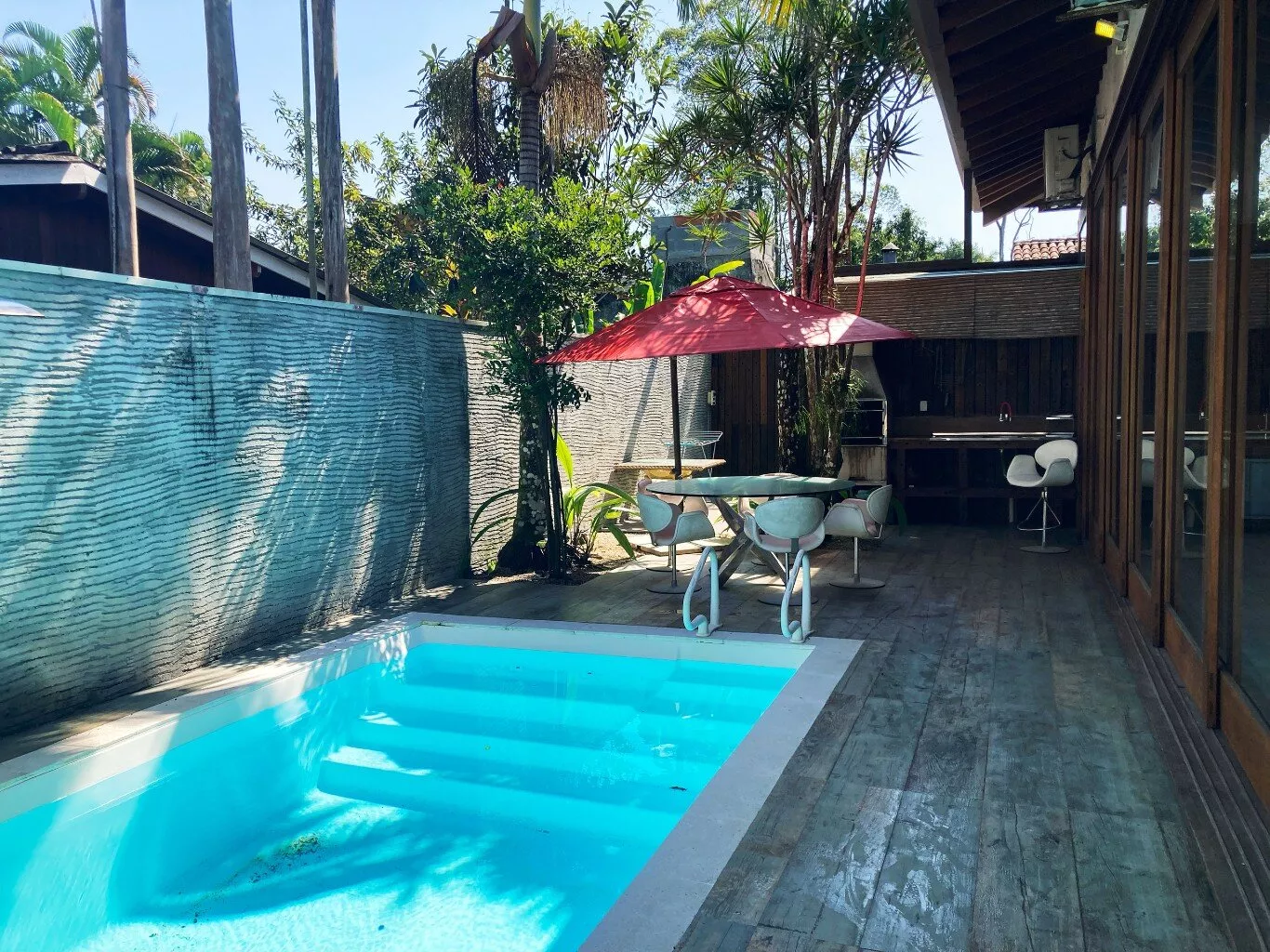 A área externa é um verdadeiro paraíso, com uma piscina cercada por um jardim exuberante, onde a tranquilidade e a beleza da vegetação local proporcionam um clima relaxante e único. Seja para momentos de descanso ou para aproveitar a companhia de amigos, este é o cenário ideal para dias inesquecíveis.