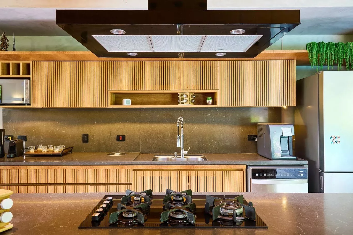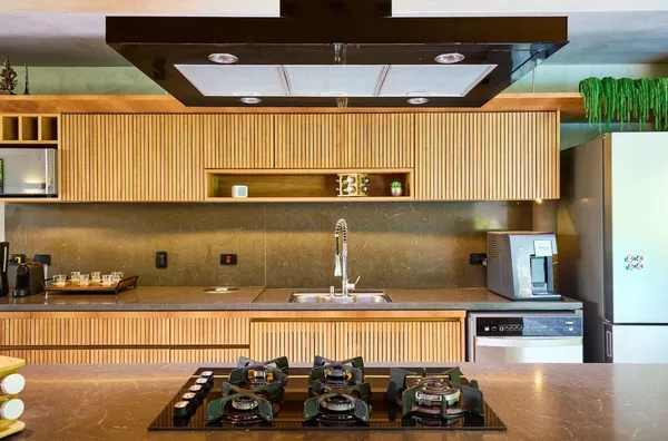 Cooktop, geladeira grande, forno elétrico, micro-ondas, purificador de água (com opção gelada), liquidificador, cafeteira, torradeira, sanduicheira e todos os utensílios necessários para preparar suas refeições com praticidade.
