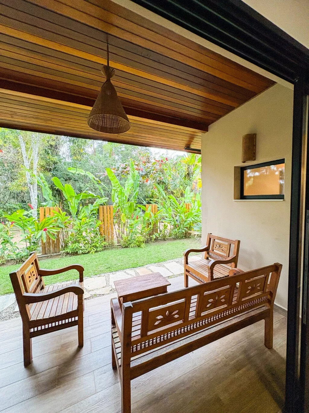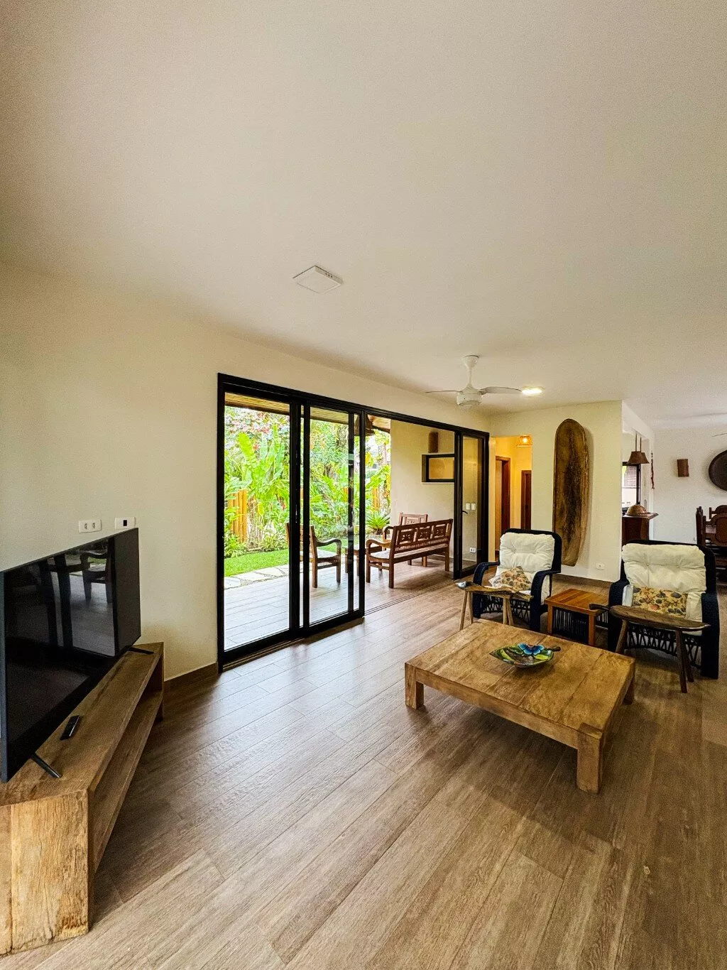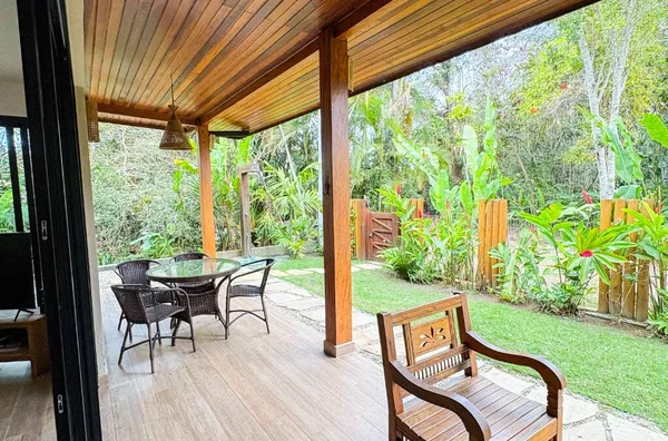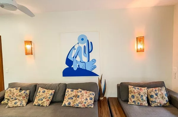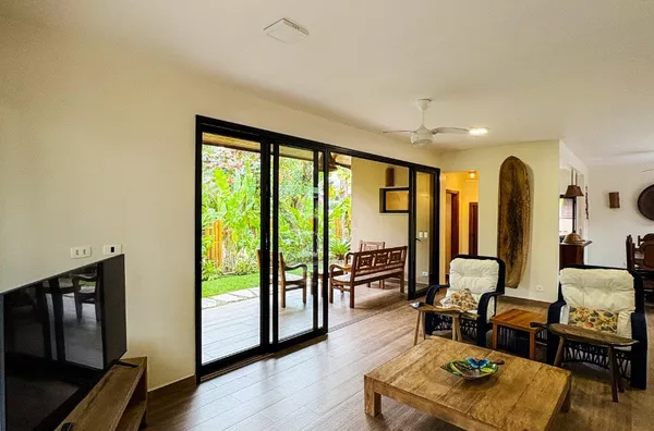 Da varanda ampla, o visual é puro encanto: a vegetação de restinga típica da região se mistura ao som suave das ondas, criando aquele clima único de praia que relaxa só de estar ali. A sala de estar é toda integrada, com aberturas generosas que deixam a brisa do mar circular e a luz do dia invadir cada cantinho.