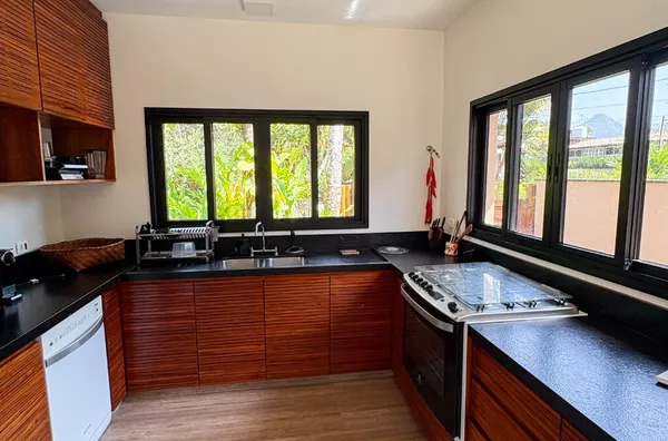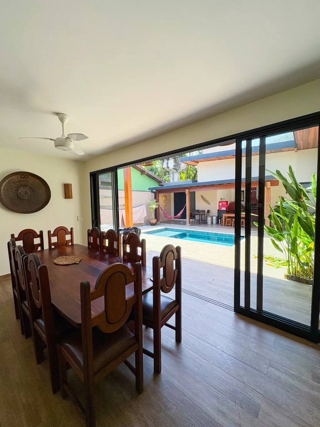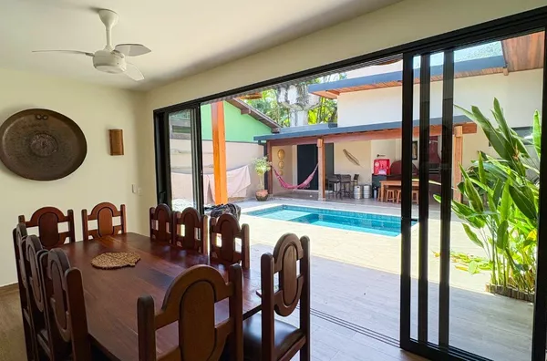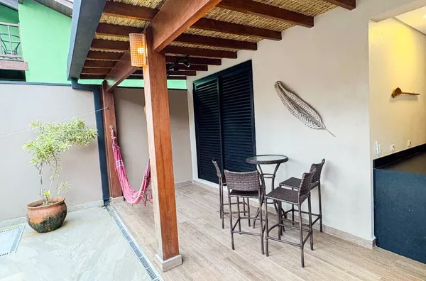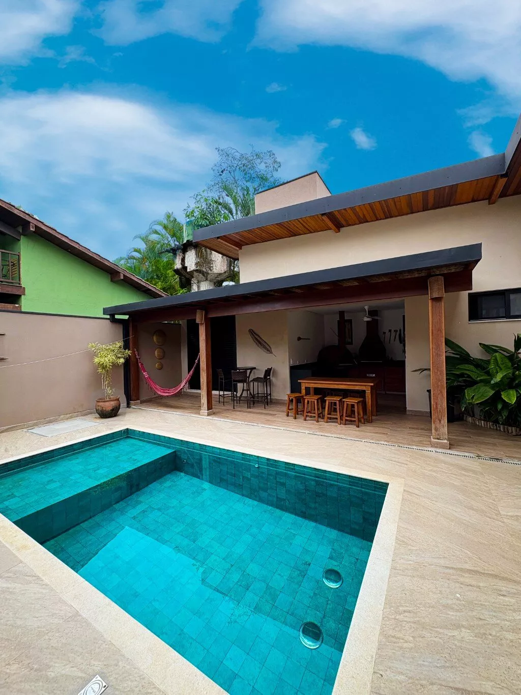 O espaço social se conecta perfeitamente à cozinha equipada, e tudo se estende até o pátio externo, onde a piscina cristalina vira o ponto de encontro oficial da casa. Ao lado, um espaço gourmet completo com churrasqueira e forno de pizza garante que cada refeição tenha sabor de férias.
