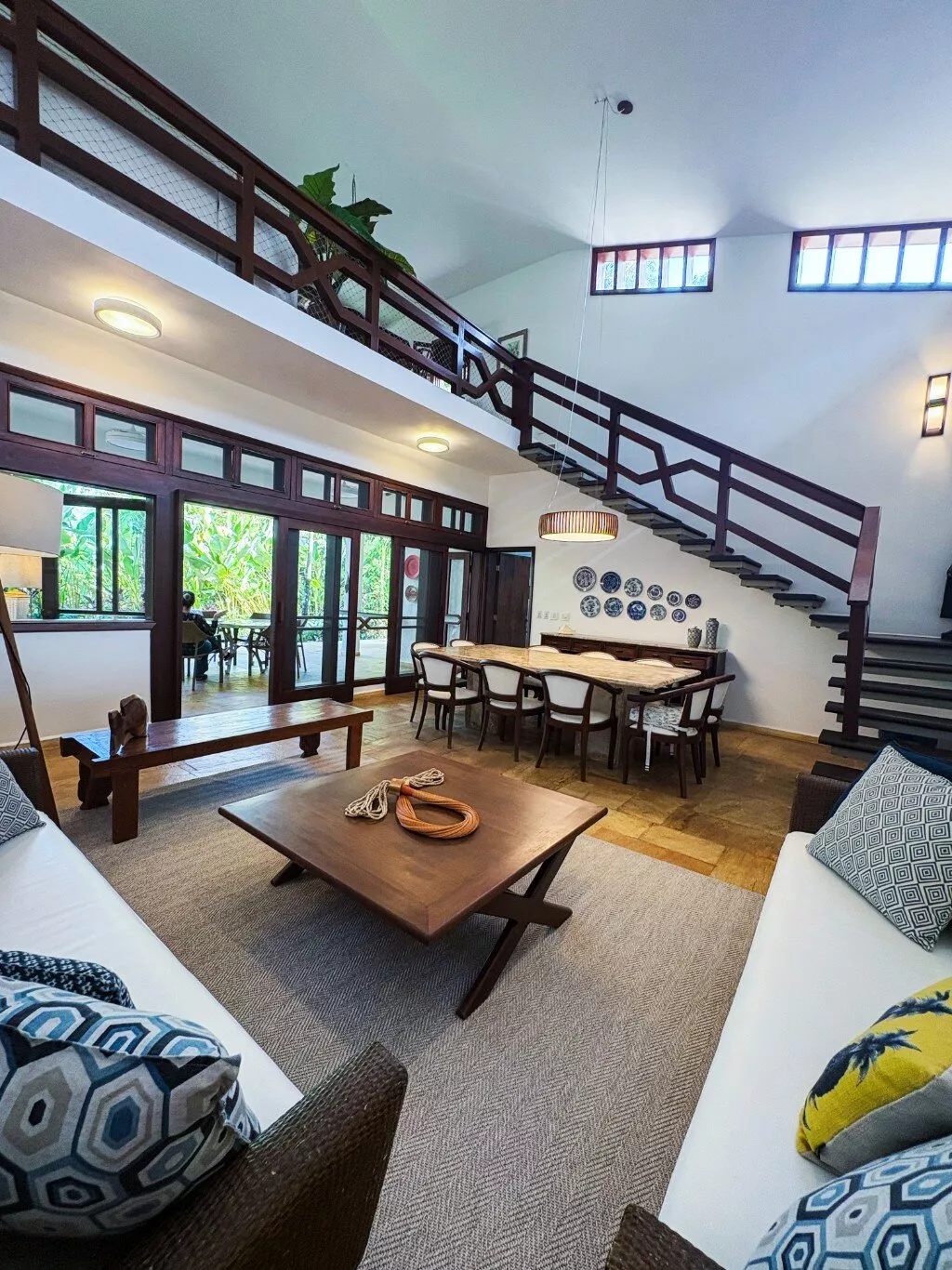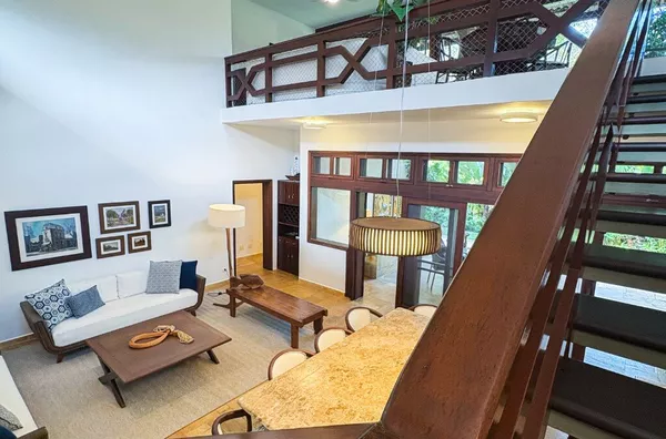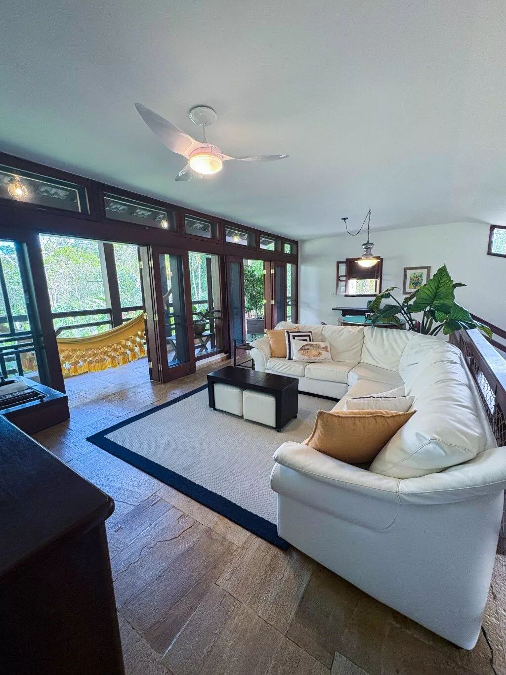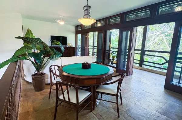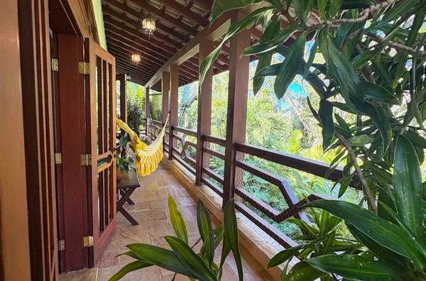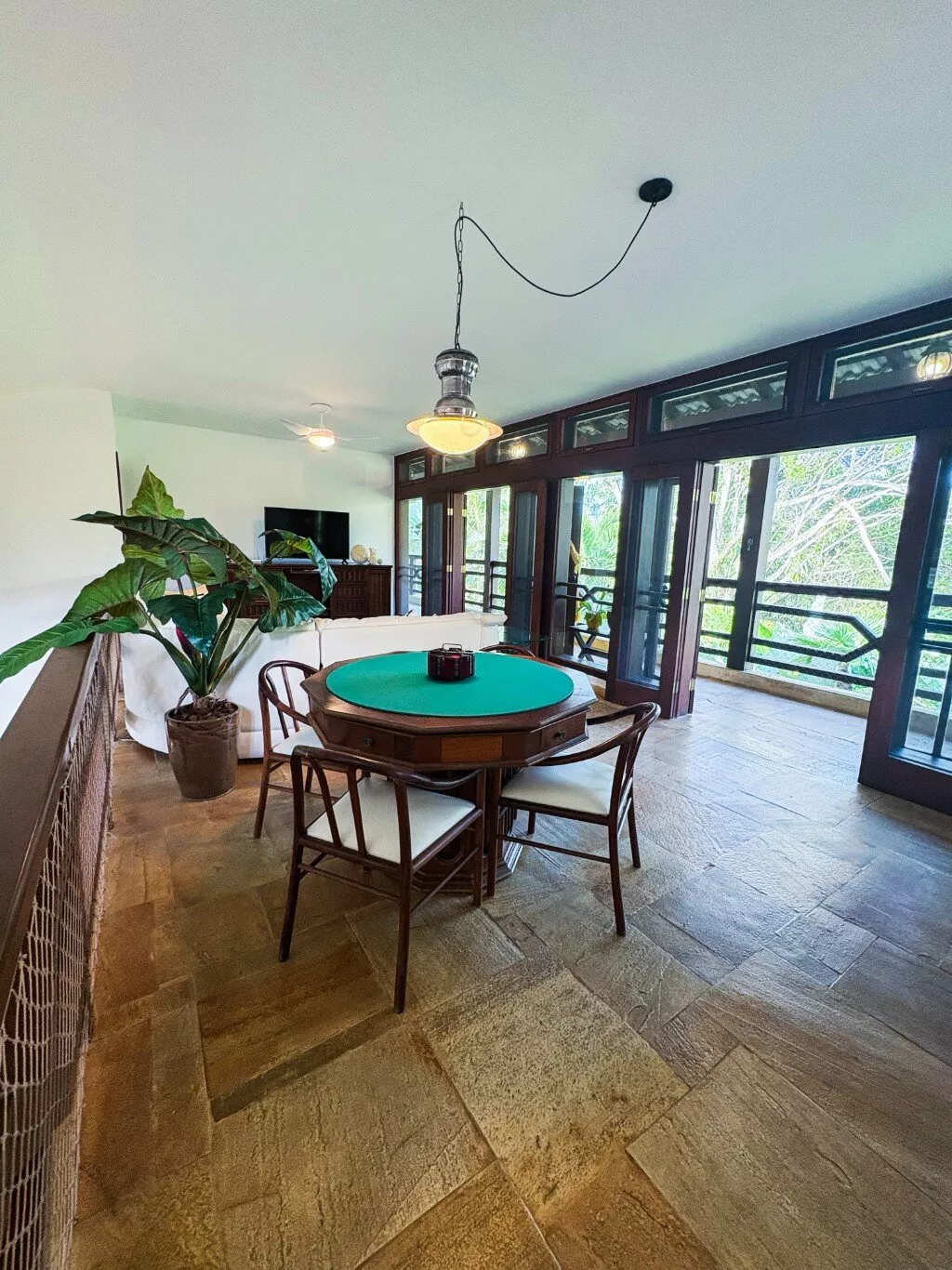 No andar superior, uma sala de TV espaçosa com mesa de jogos e uma varanda panorâmica com vista para a Mata Atlântica — o cenário perfeito para relaxar ou brindar o pôr do sol.