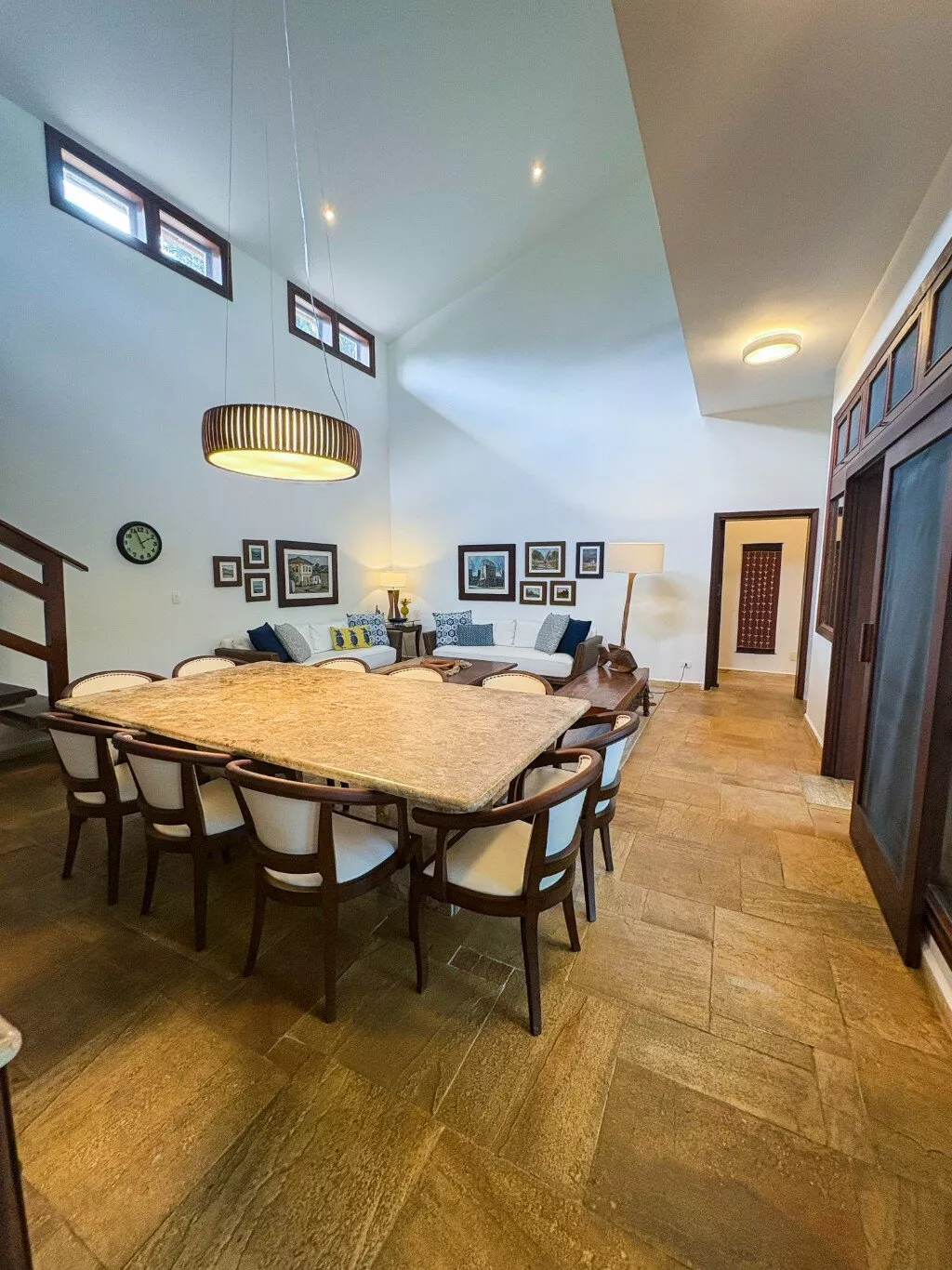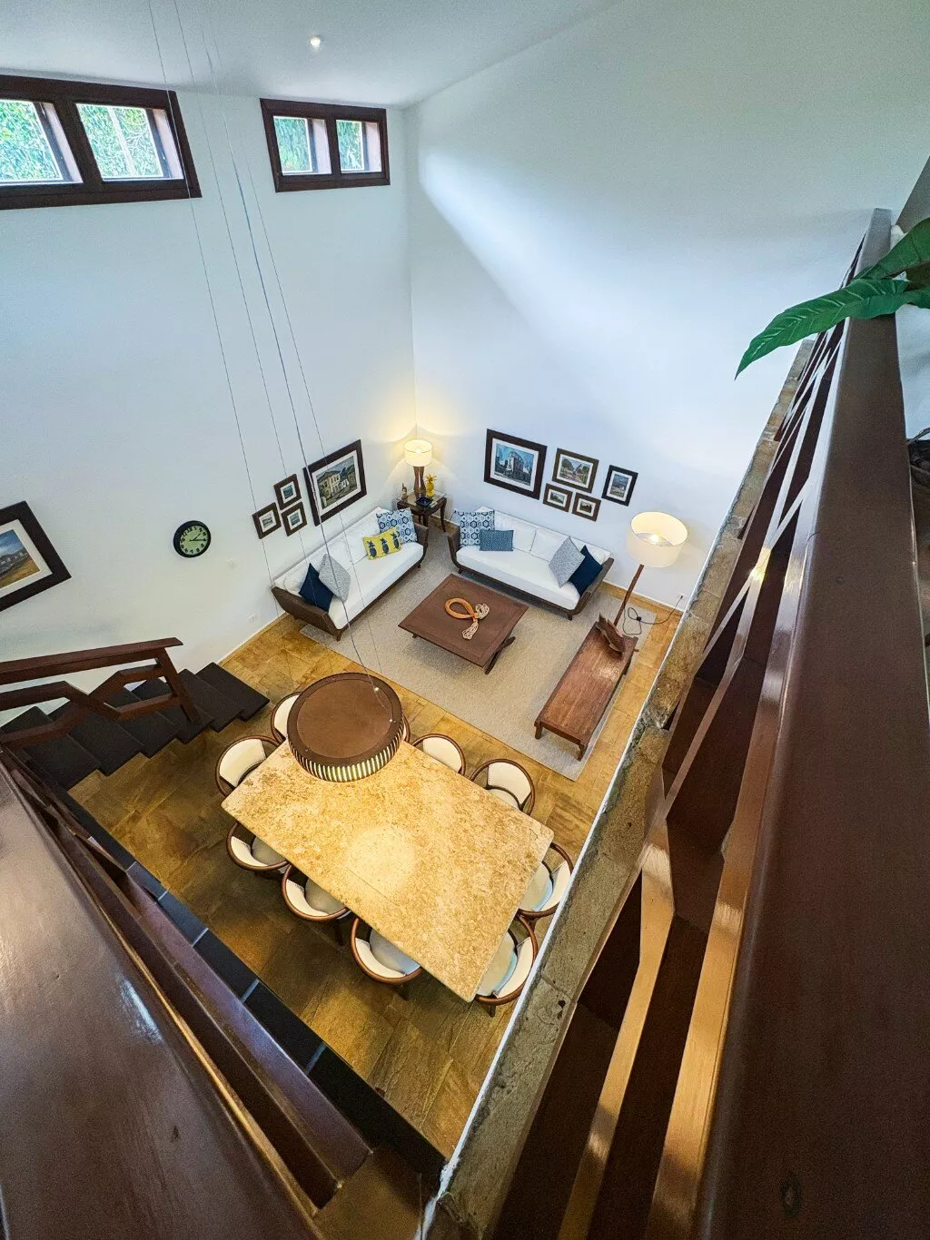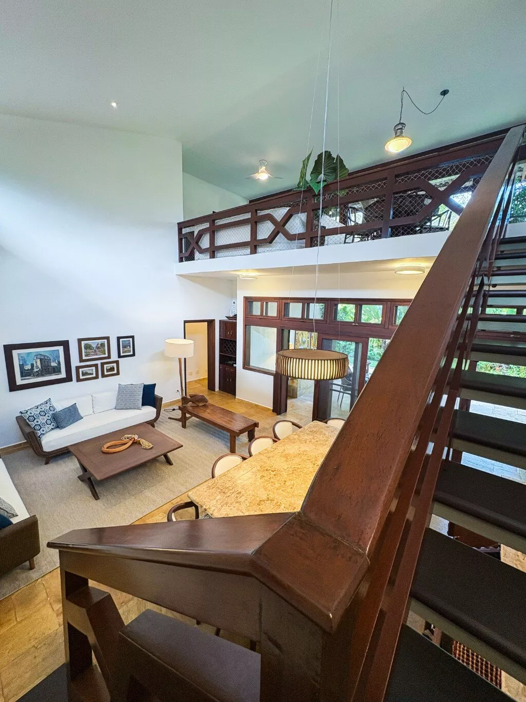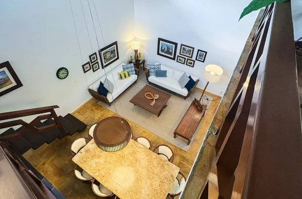No andar superior, uma sala de TV espaçosa com mesa de jogos e uma varanda panorâmica com vista para a Mata Atlântica — o cenário perfeito para relaxar ou brindar o pôr do sol.