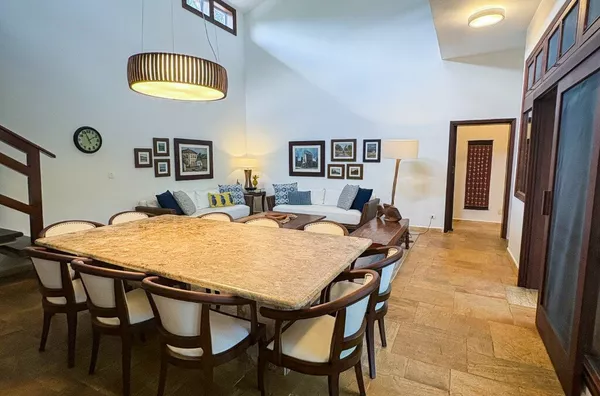 Na área social, uma sala de estar e jantar integradas, ampla e aconchegante, conecta-se à varanda gourmet com churrasqueira e uma grande mesa cercada por um jardim exuberante, onde a natureza abraça cada momento.