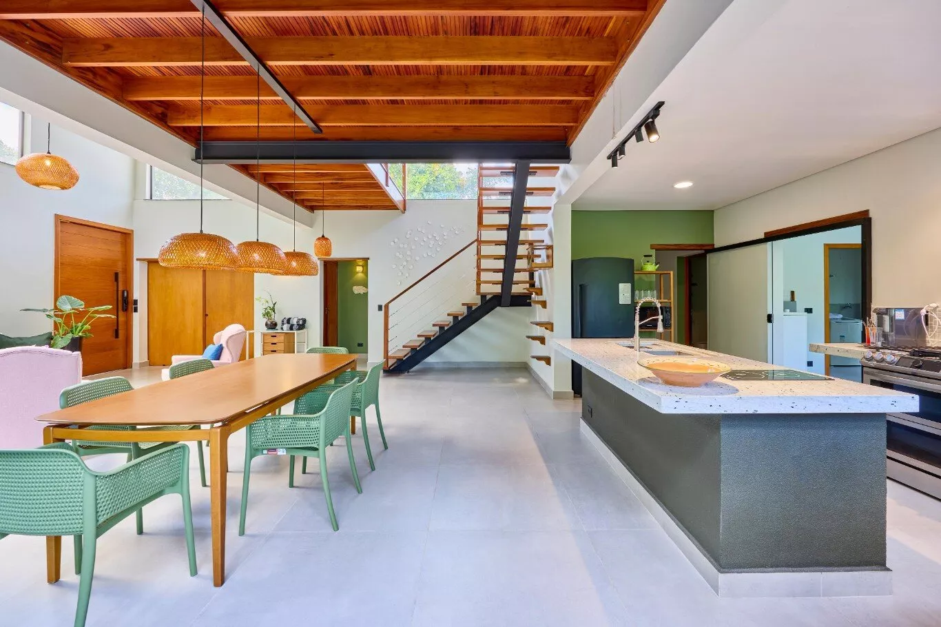 Ampla, arejada e generosamente iluminada, a casa valoriza a luz natural por meio de grandes aberturas de vidro, que deixam o verde entrar e tornam cada ambiente mais vivo, mais calmo, mais agradável.