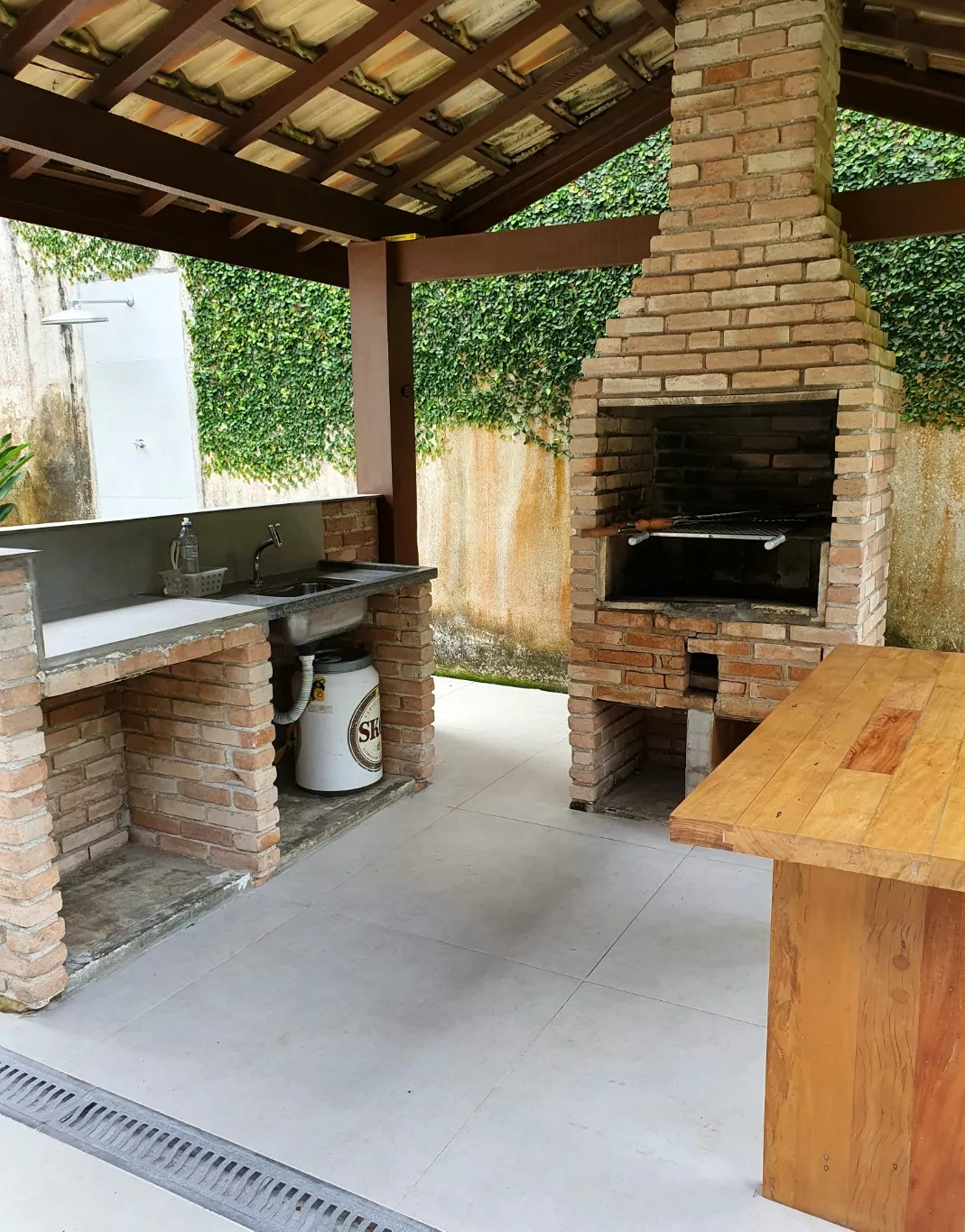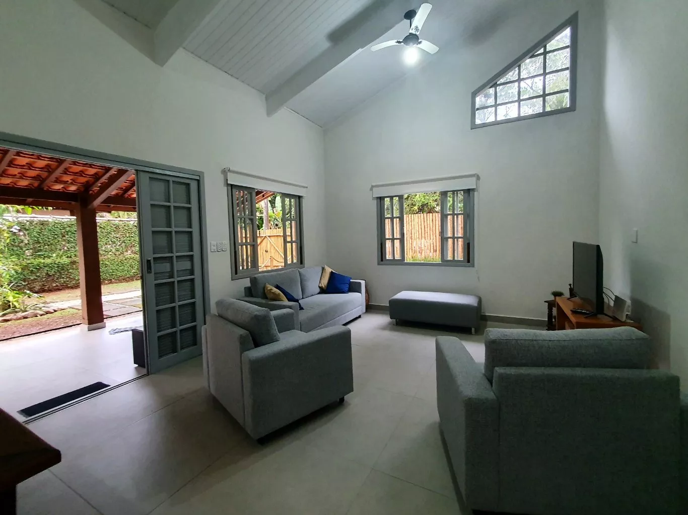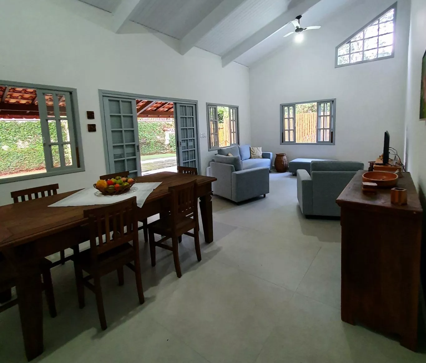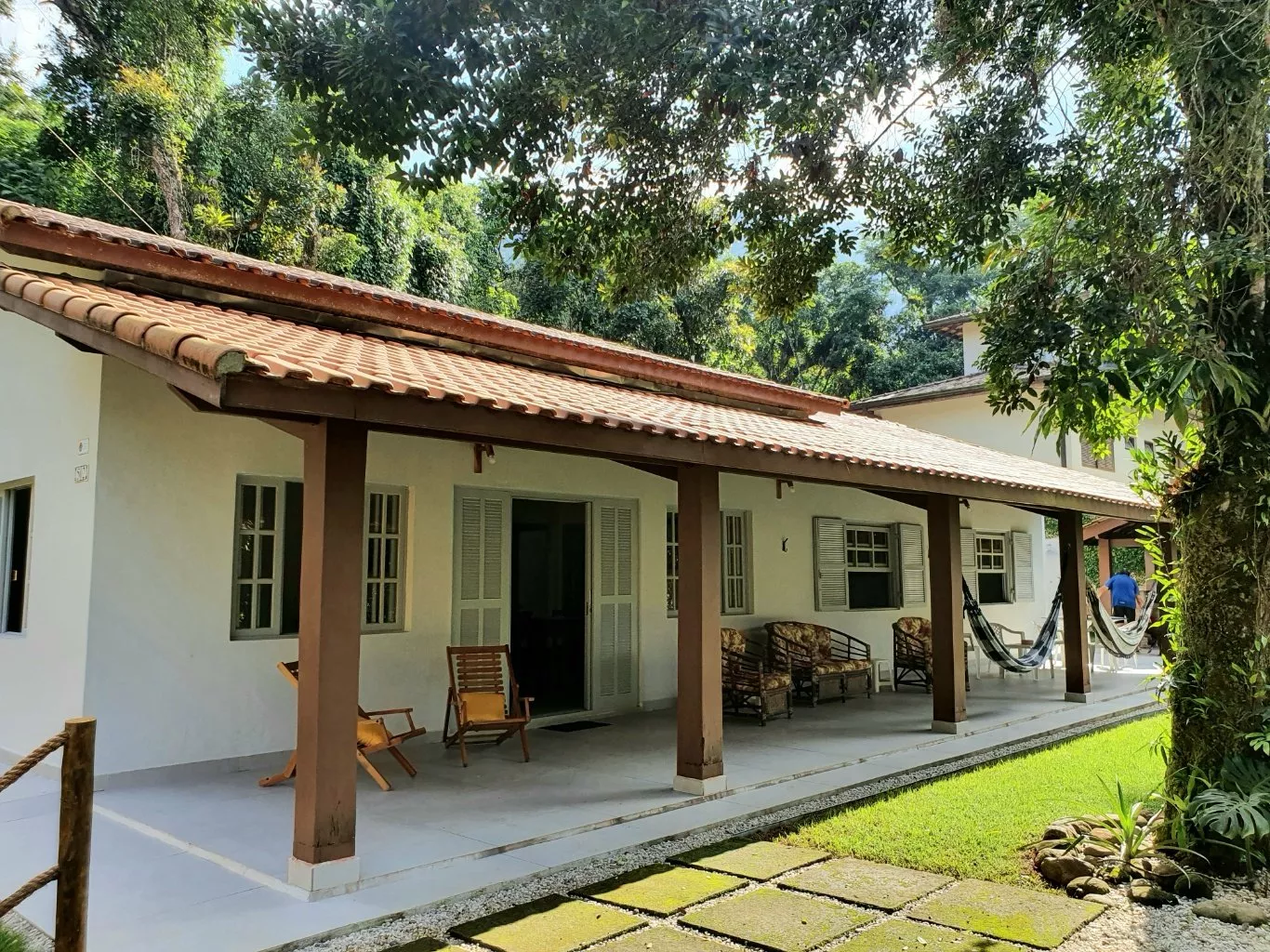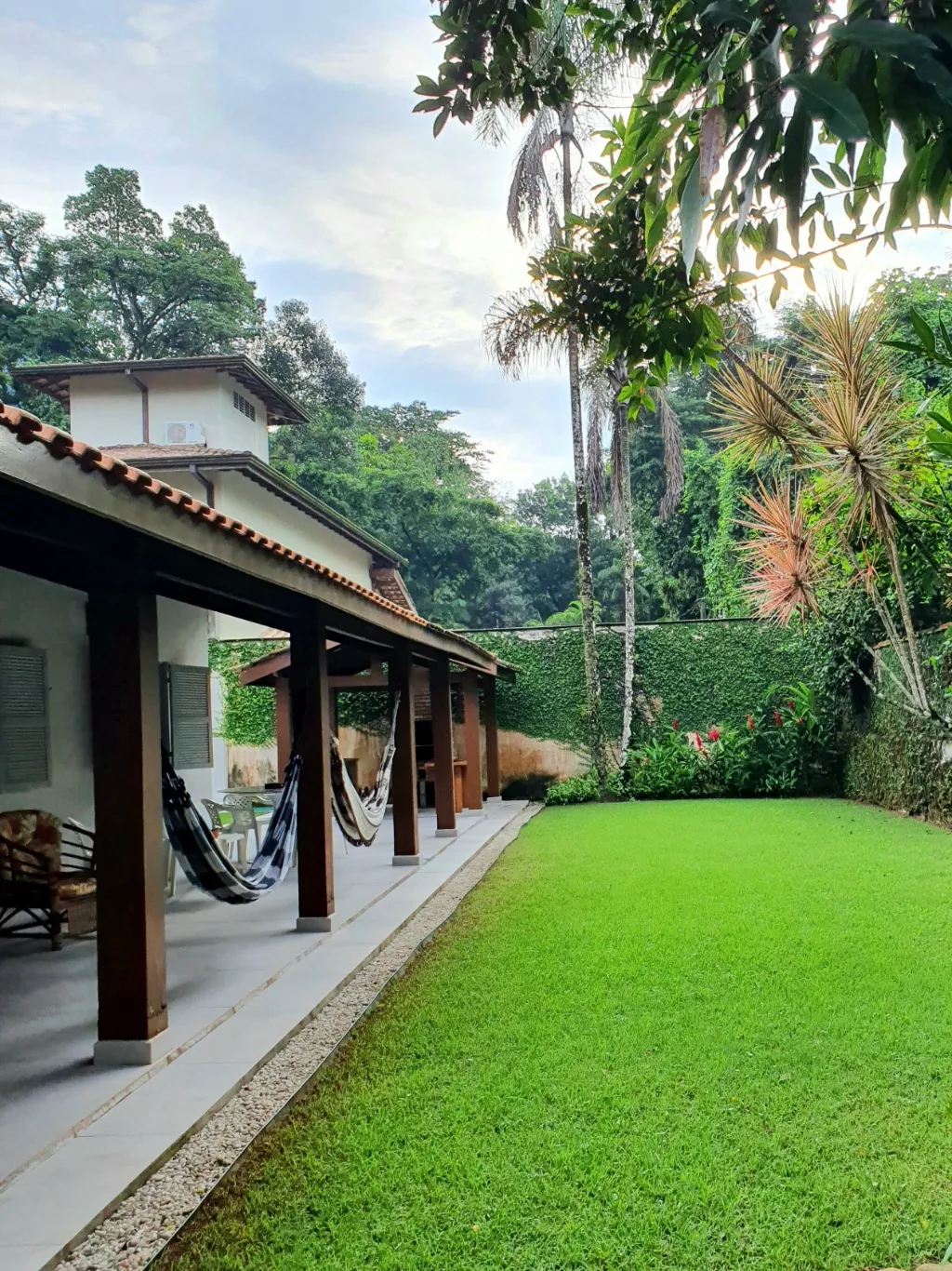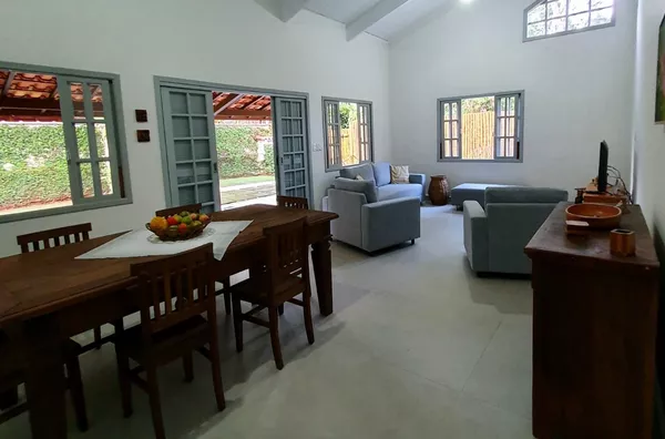 Áreas adicionais: sala estar e jantar, cozinha, varanda, área de serviço, garagem, jardins, churrasqueira, ducha externa e despensa.
