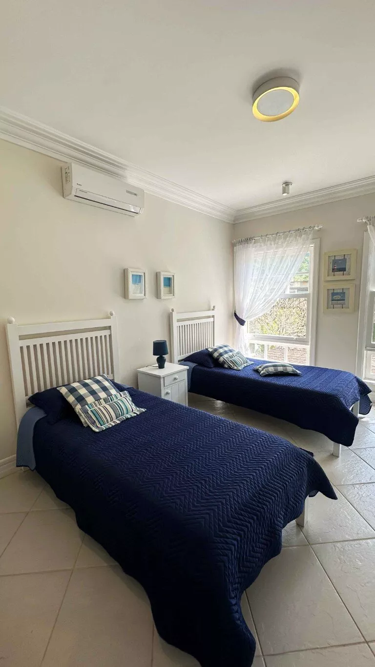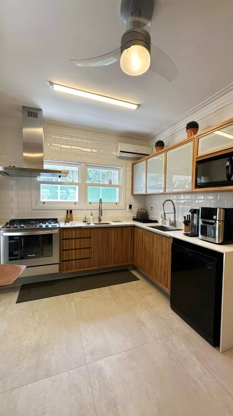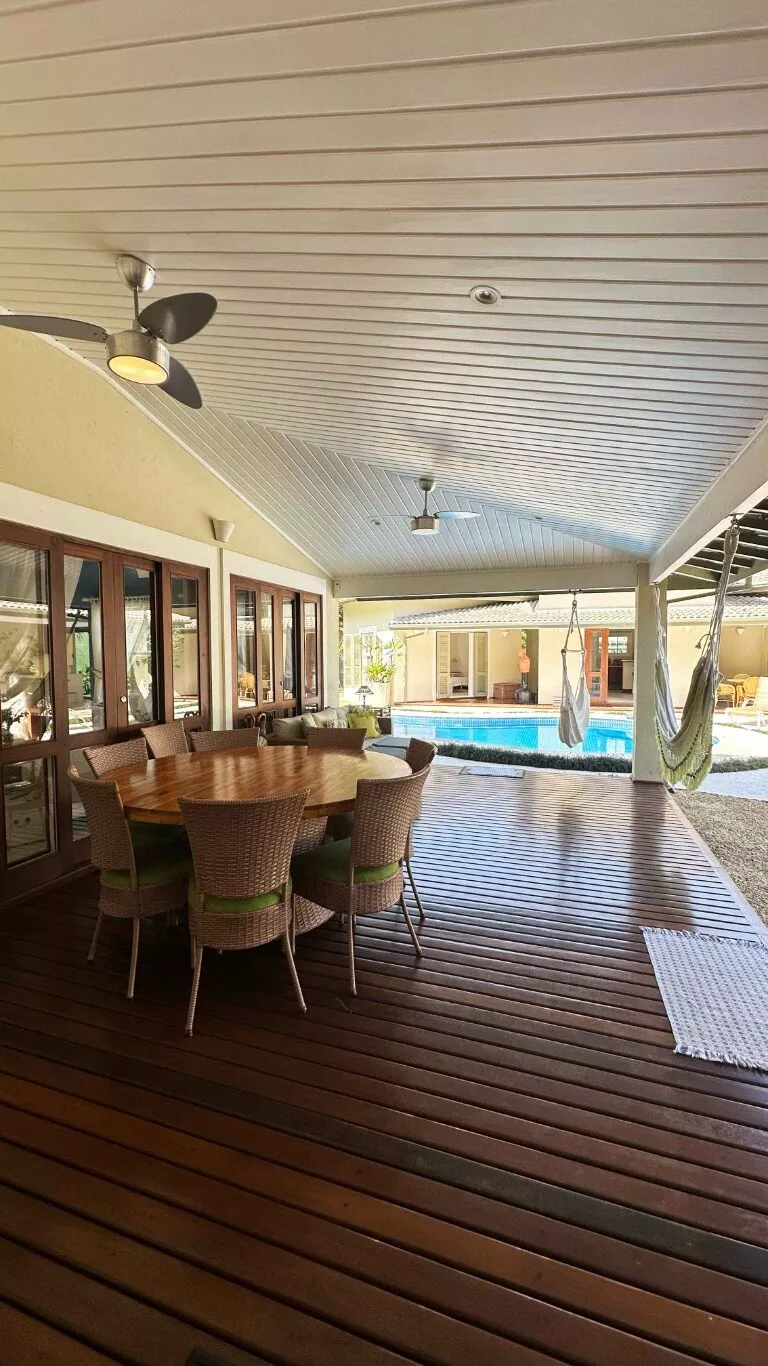 Todos os ambientes são climatizados com ar-condicionado, além de ventiladores de teto, inclusive nas varandas abertas, garantindo frescor mesmo nos dias mais quentes. A casa possui aquecimento de água a gás com três sistemas independentes e rede hidráulica pressurizada, oferecendo excelente conforto no uso diário.