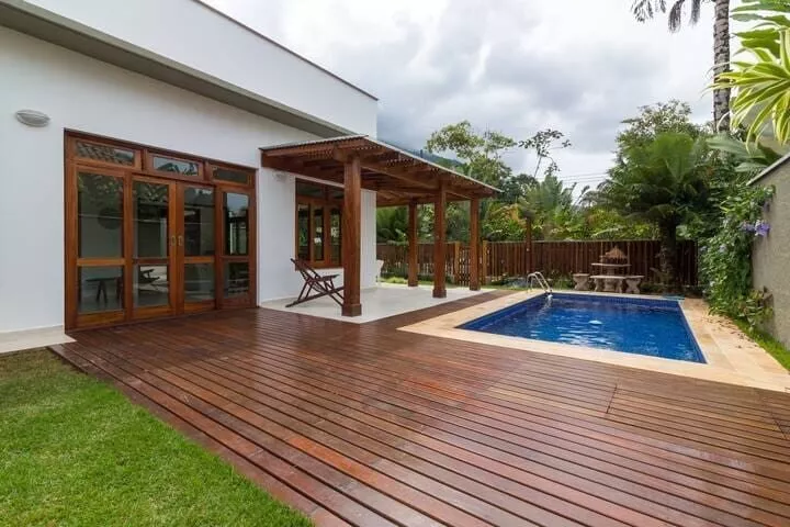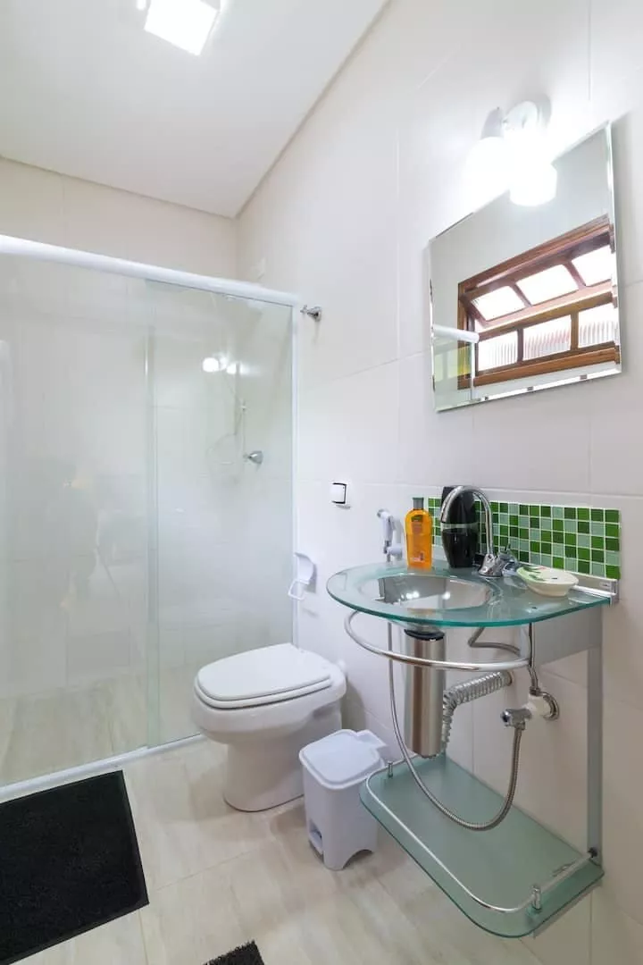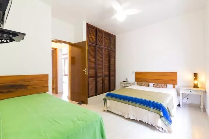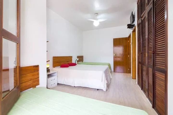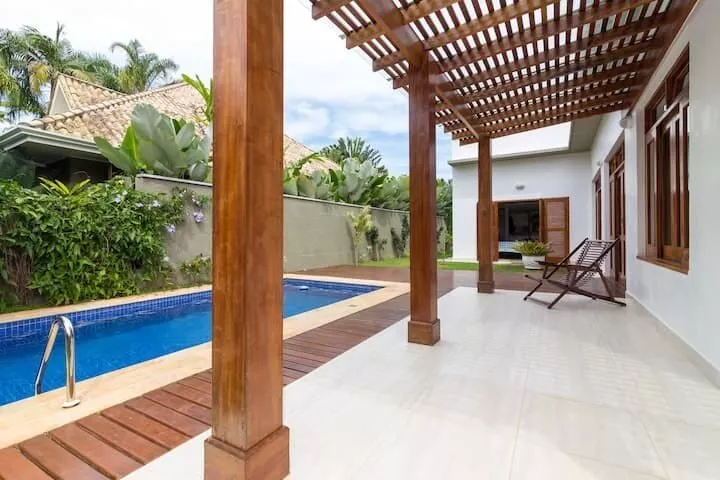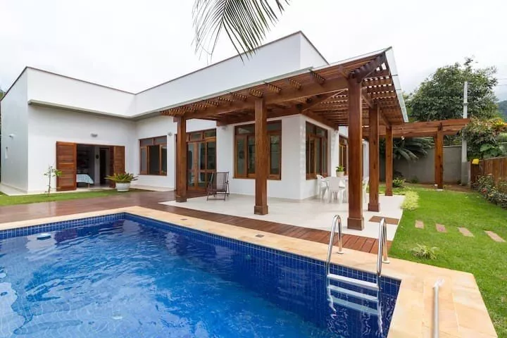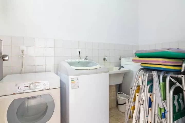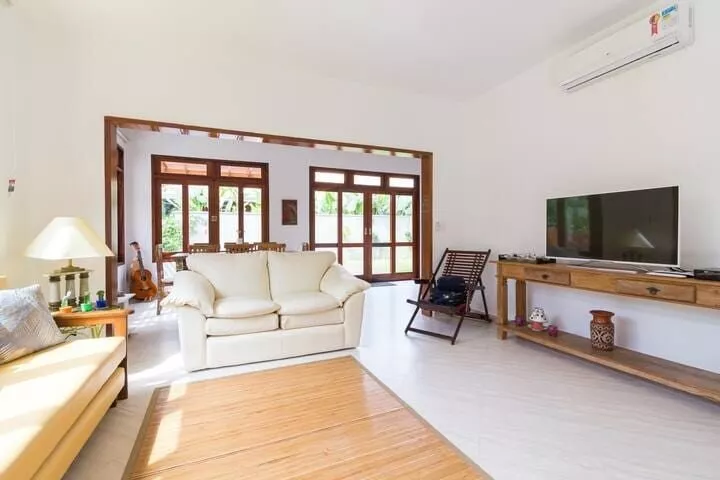 Casa ampla e arejada a 120 metros da praia, acomoda até 11 pessoas, com 4 suítes, Cozinha completa - com máquina de lavar louças, TV Sky na sala de estar e nas suítes, ar condicionado em todos ambientes (suítes e sala), piscina, Churrasqueira equipada, lavanderia com máquina de lavar roupas e secadora.