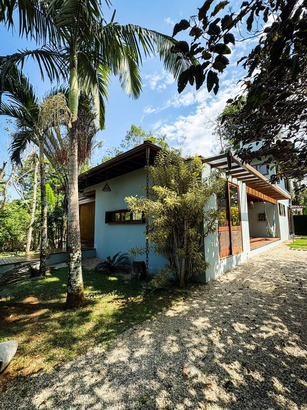 A apenas 300 metros da praia, o som do mar se mistura ao canto dos pássaros e à brisa suave que atravessa as grandes janelas de madeira e vidro, abrindo a casa por inteiro para o verde do jardim e a piscina envolta pela Mata Atlântica.