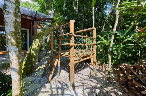 Área externa com lindo paisagismo e espaço para crianças pequenas, incluindo um playground de madeira com casinha, escorregador, balanço, trepa-trepa, brinquedos diversos como carro com pedal (que também tem haste para ser empurrado), caminhões, baldes e pás para brincadeira na areia; e para crianças maiores, um slackline de 4,5 metros de comprimento.