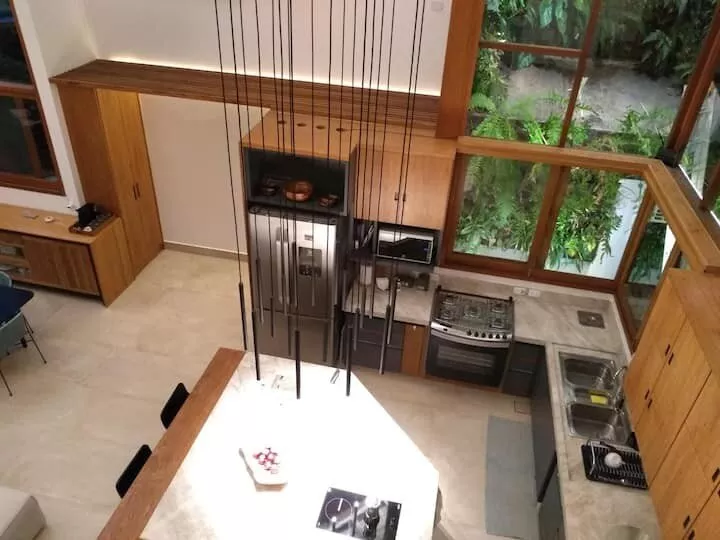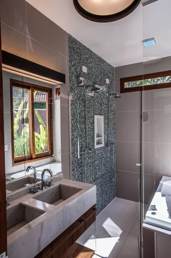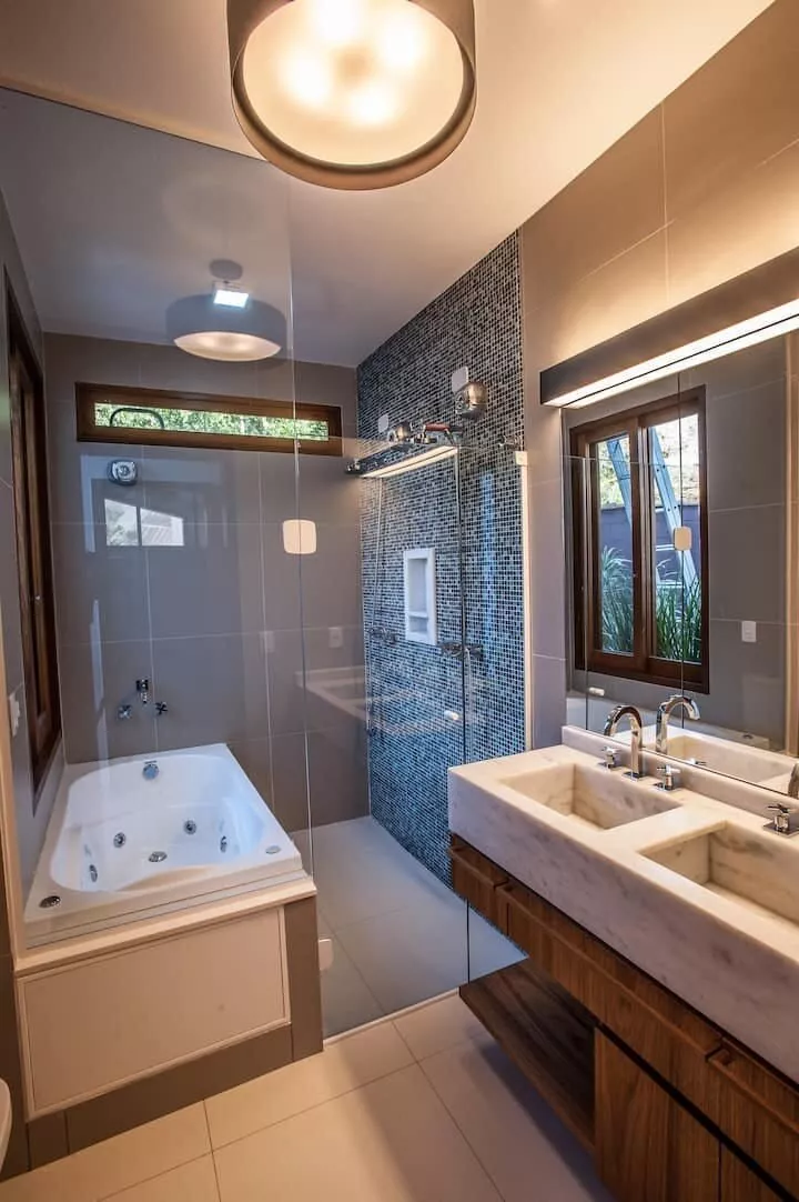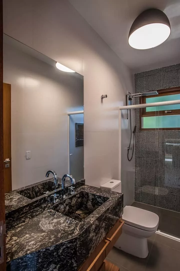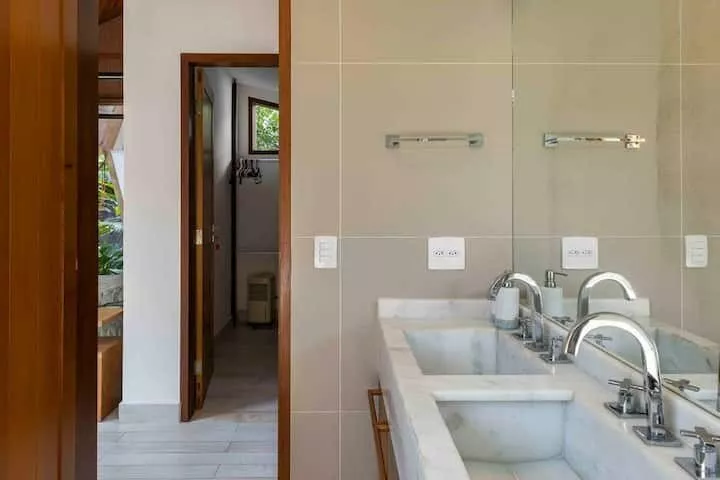 São 3 suítes, sendo 2 delas master com banheira de hidromassagem, chuveiro duplo, closet. Terceira suíte no segundo andar, acesso por escada tipo Santos Dumont. Cozinha completa e spa aquecido.