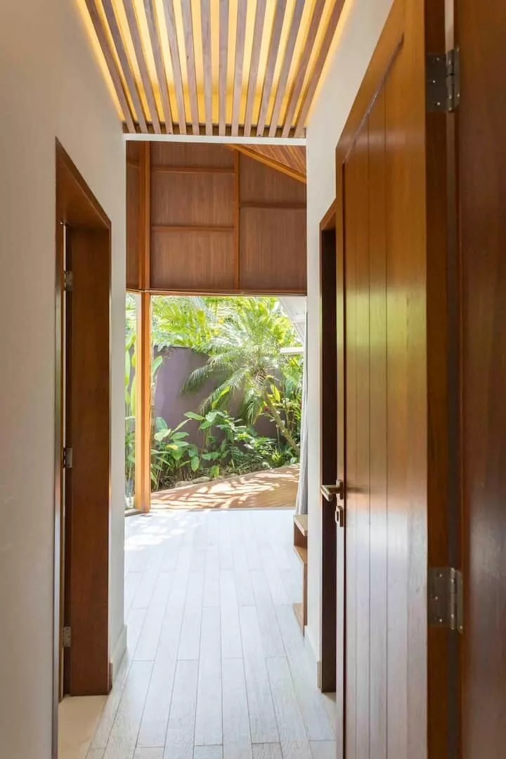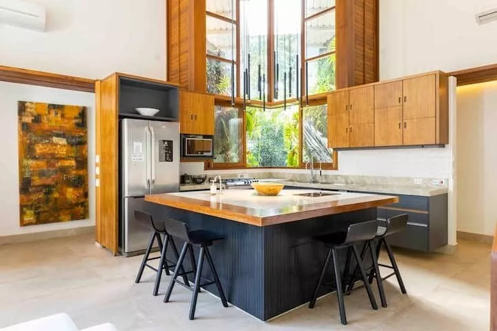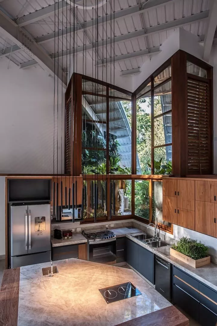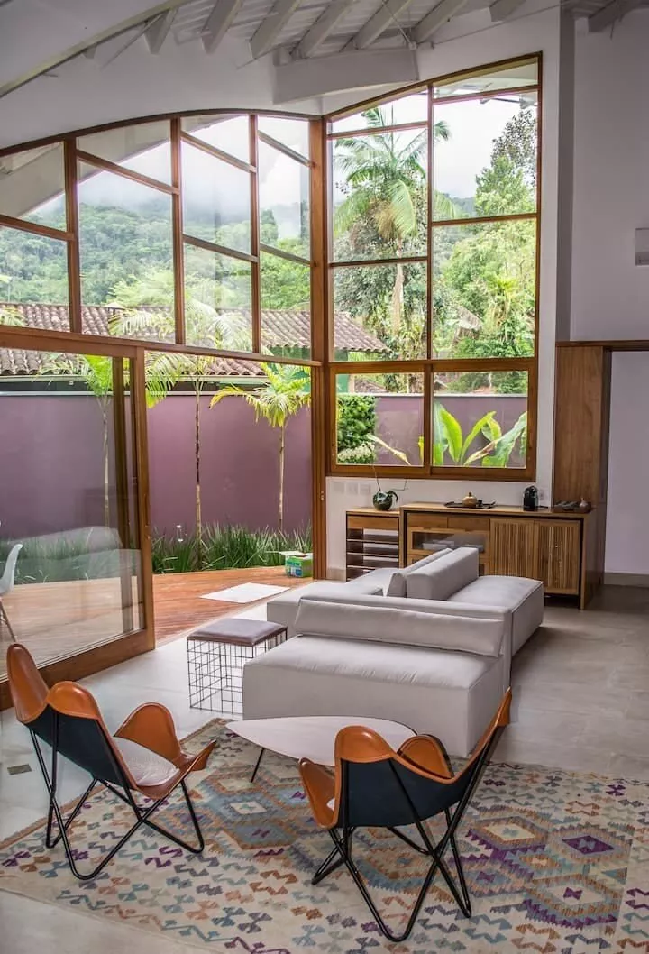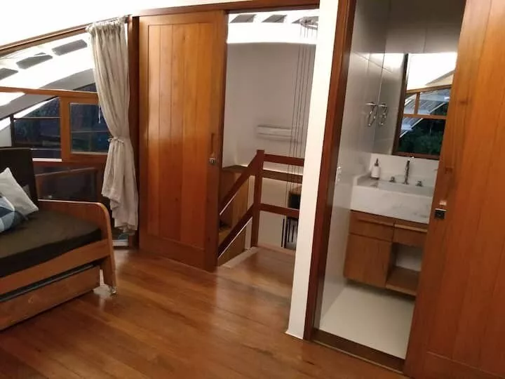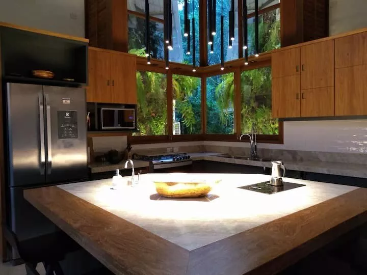 São 3 suítes, sendo 2 delas master com banheira de hidromassagem, chuveiro duplo, closet. Terceira suíte no segundo andar, acesso por escada tipo Santos Dumont. Cozinha completa e spa aquecido.