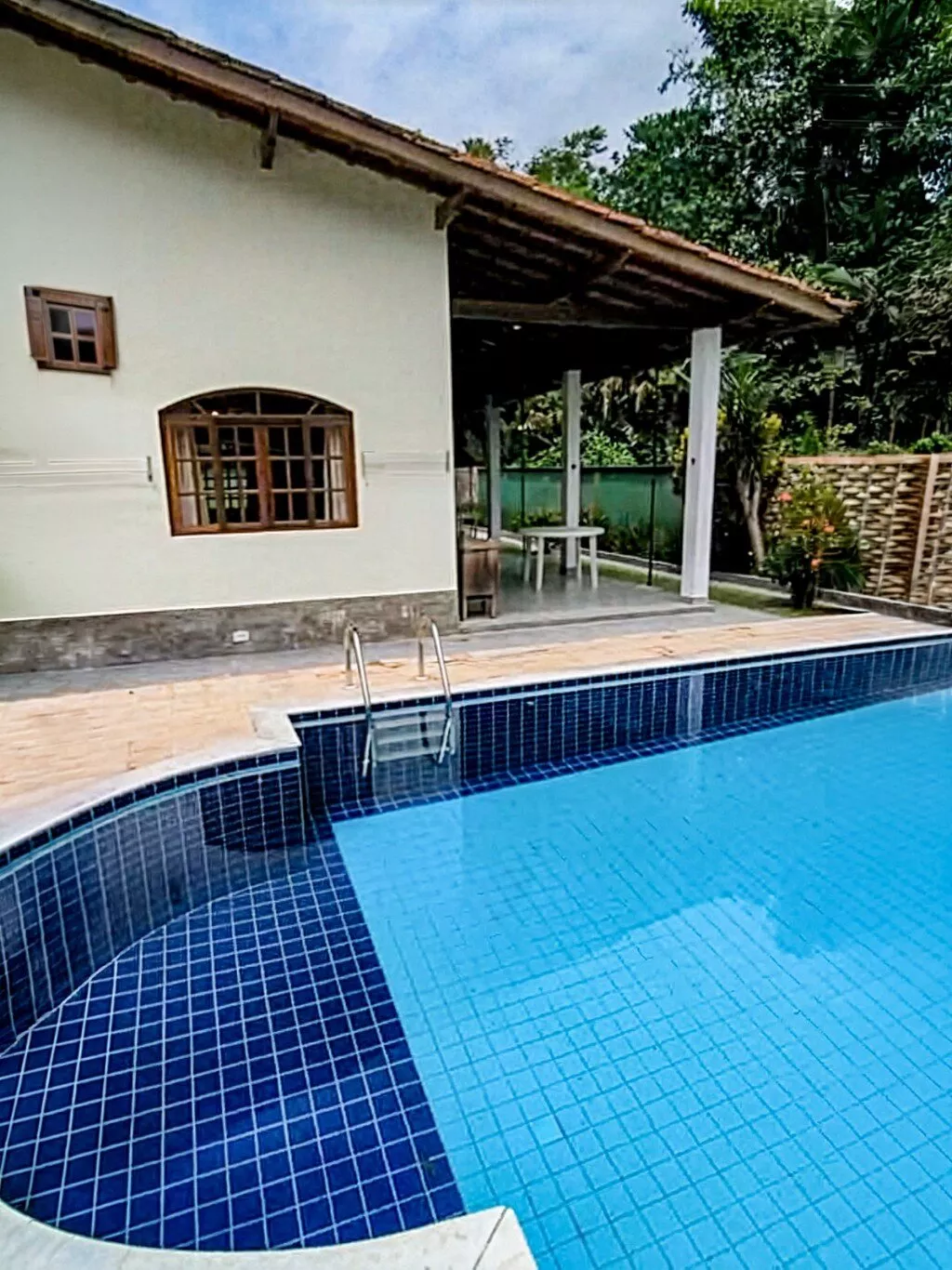 Na área externa, a piscina e o espaço com churrasqueira oferecem um ambiente funcional e agradável para momentos de lazer, com boa integração entre os espaços e contato com a natureza.